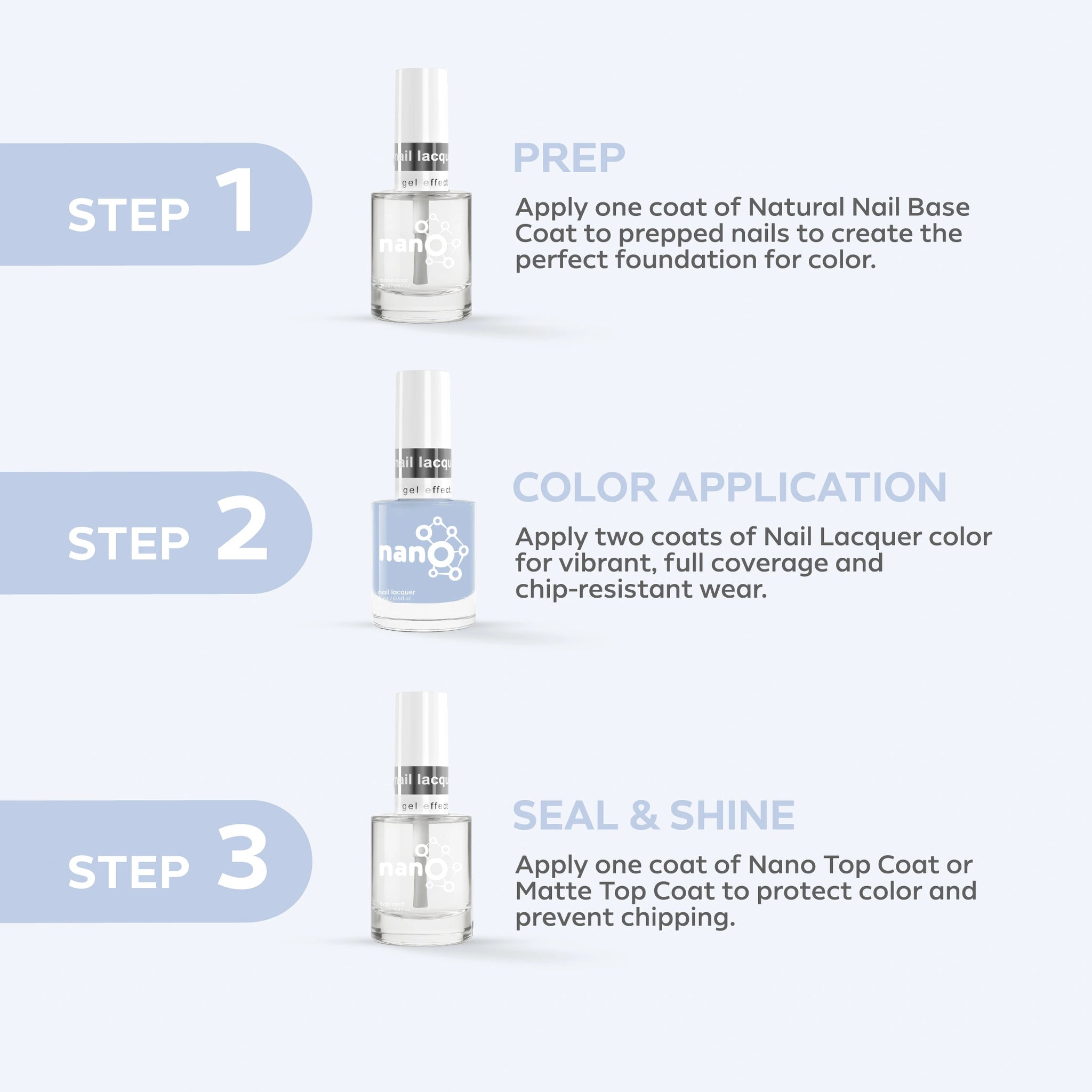 - قم بإنهاء العمل عن طريق تطبيق Nano® Normal Top Coat للحصول على لمسة نهائية لامعة تدوم طويلاً.