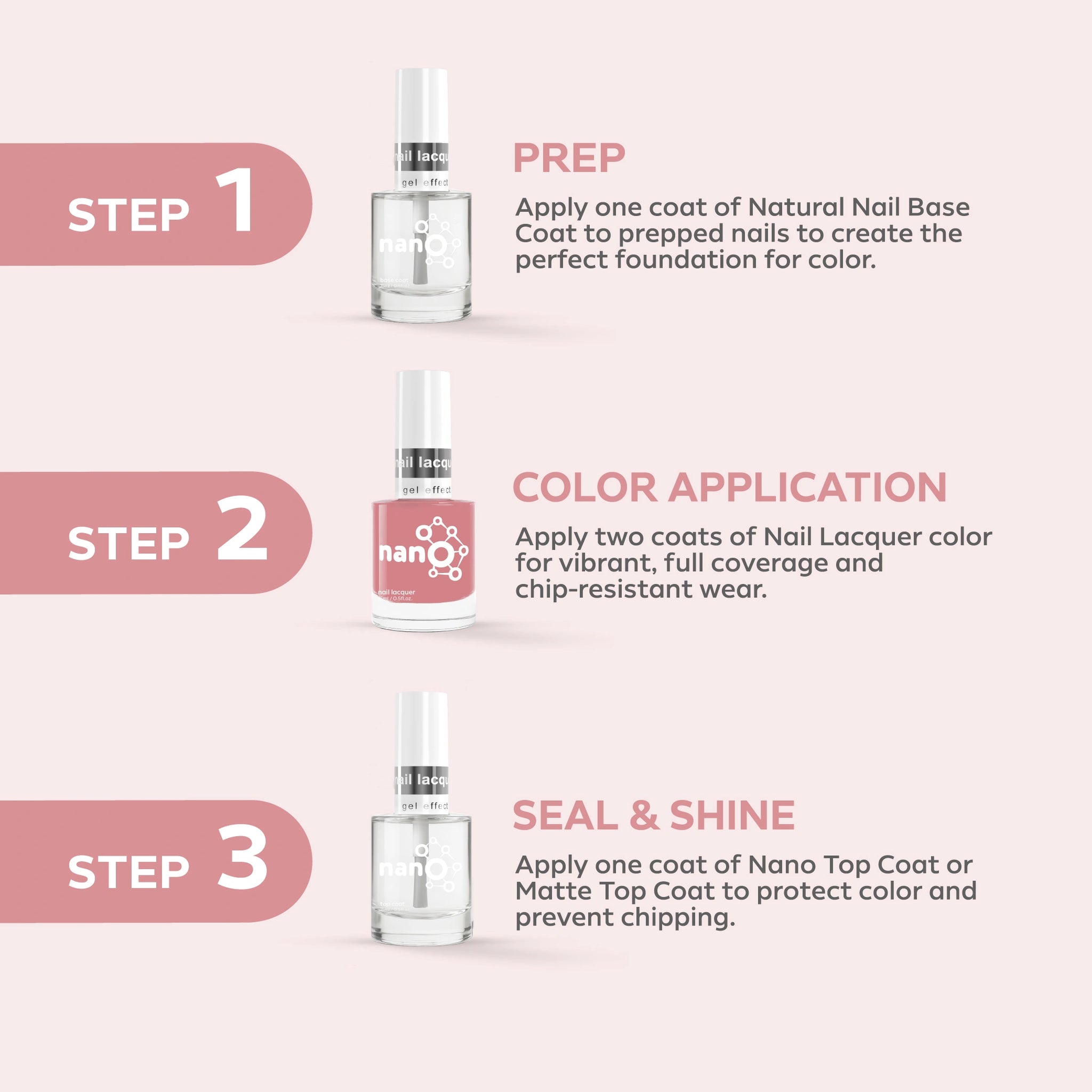 - ضعي طبقة من Nano® Normal Base Coat لحماية أظافرك الطبيعية وضمان التصاق أفضل.