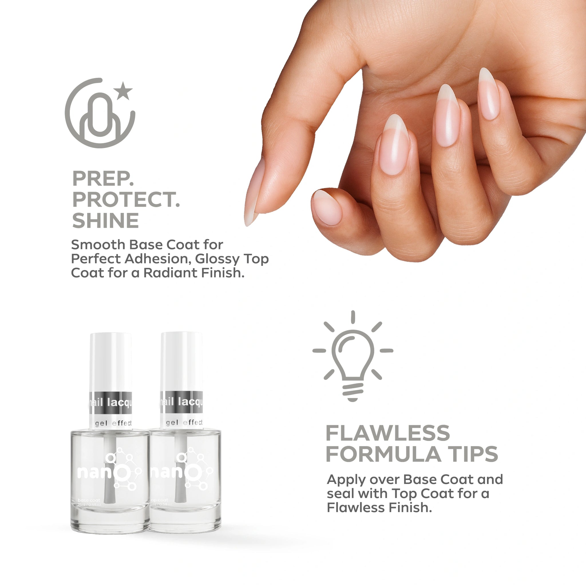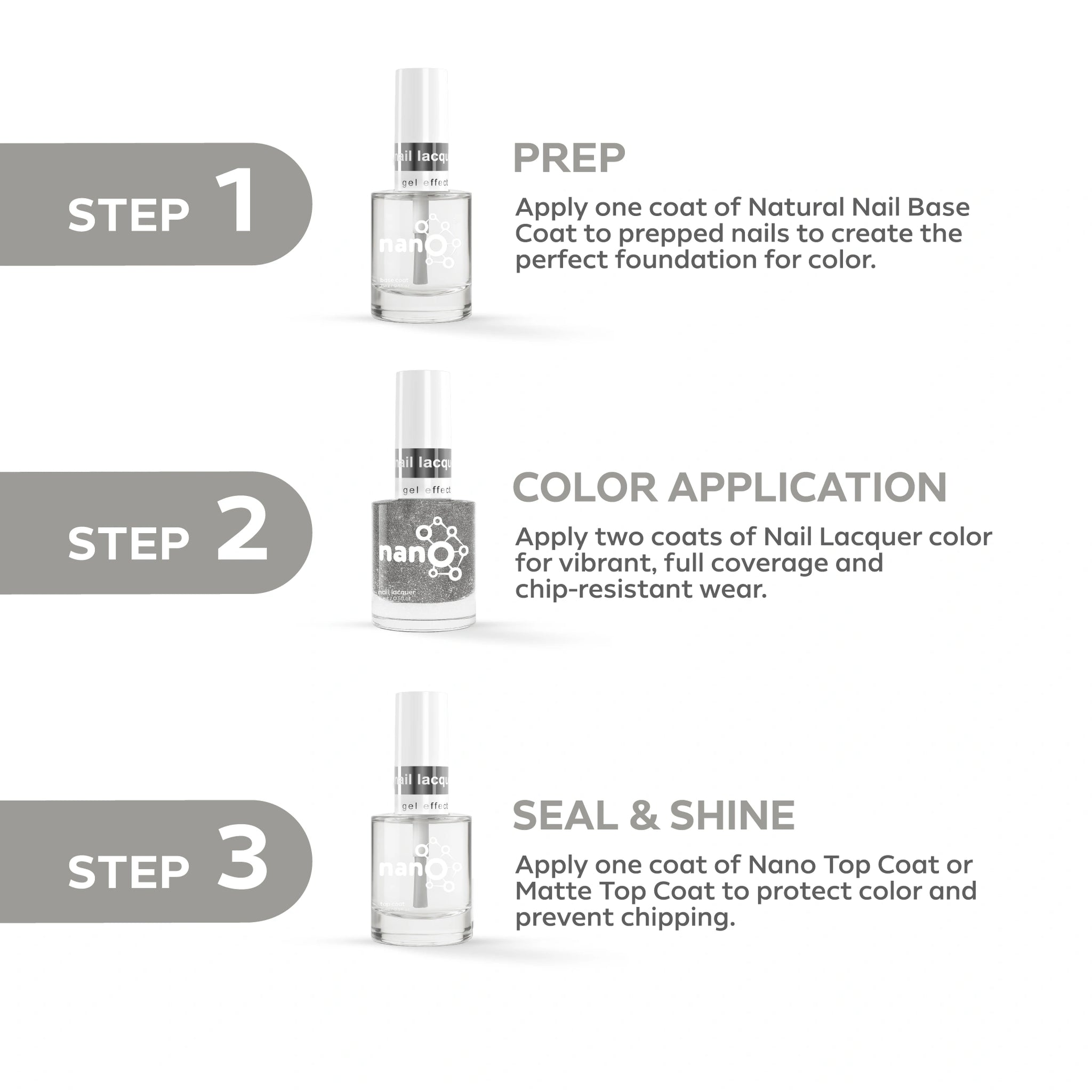 - ضعي طبقة من Nano® Normal Base Coat لحماية أظافرك الطبيعية وضمان التصاق أفضل.