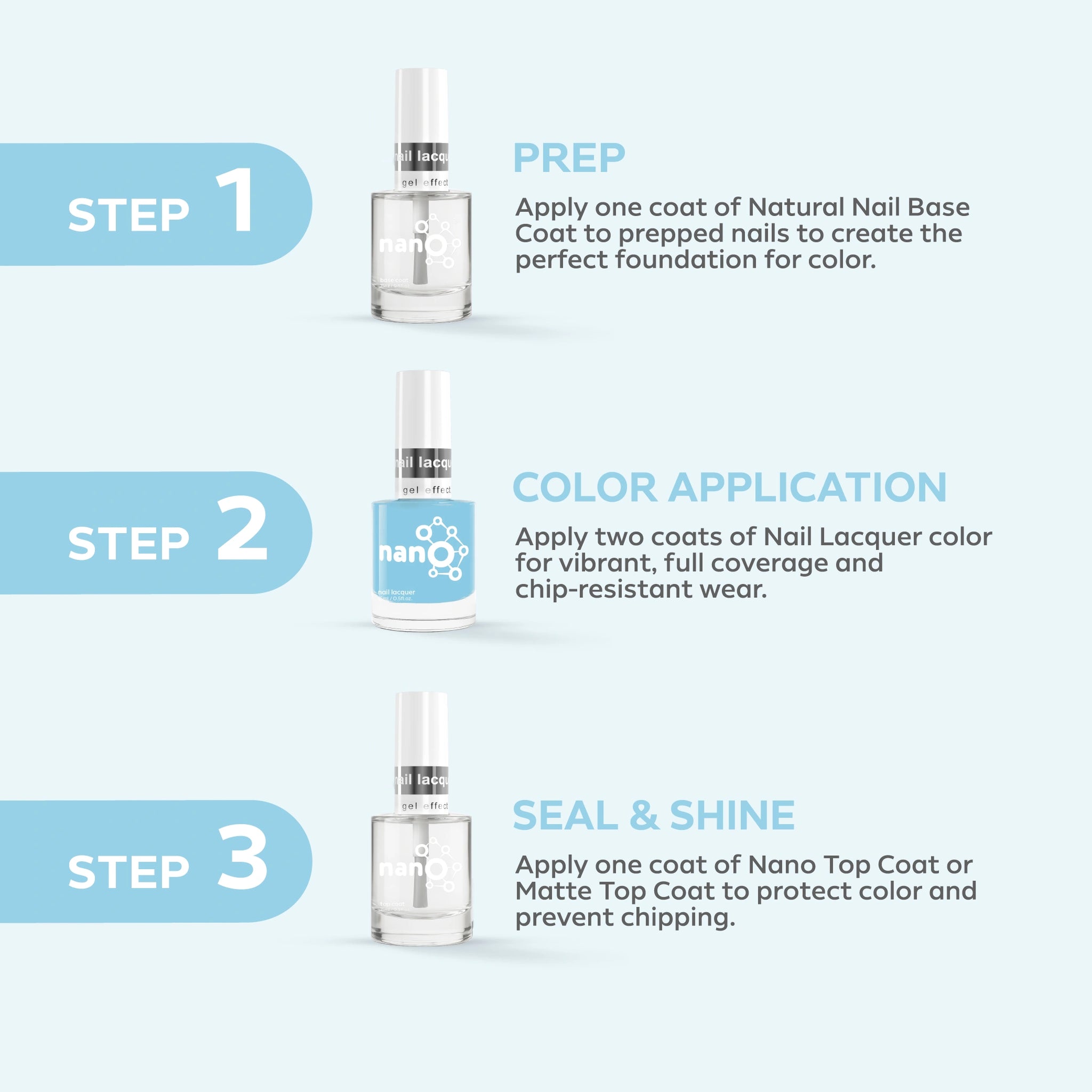 - ضعي طبقة من Nano® Normal Base Coat لحماية أظافرك الطبيعية وضمان التصاق أفضل.
