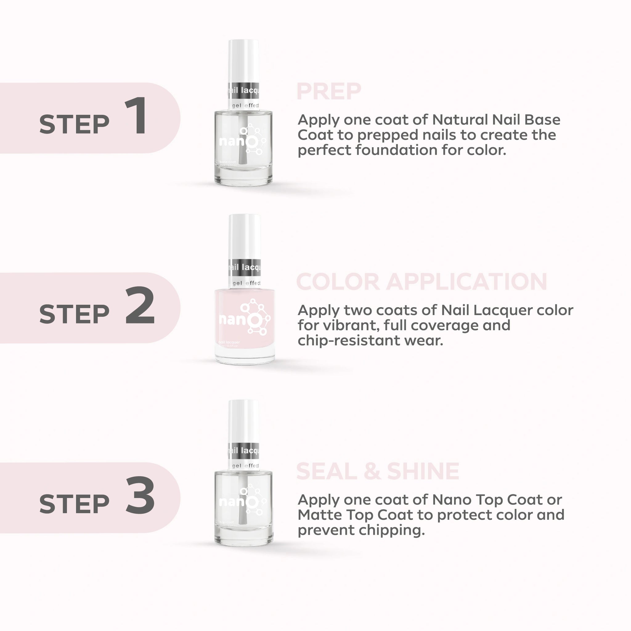 - ضعي طبقة من Nano® Normal Base Coat لحماية أظافرك الطبيعية وضمان التصاق أفضل.