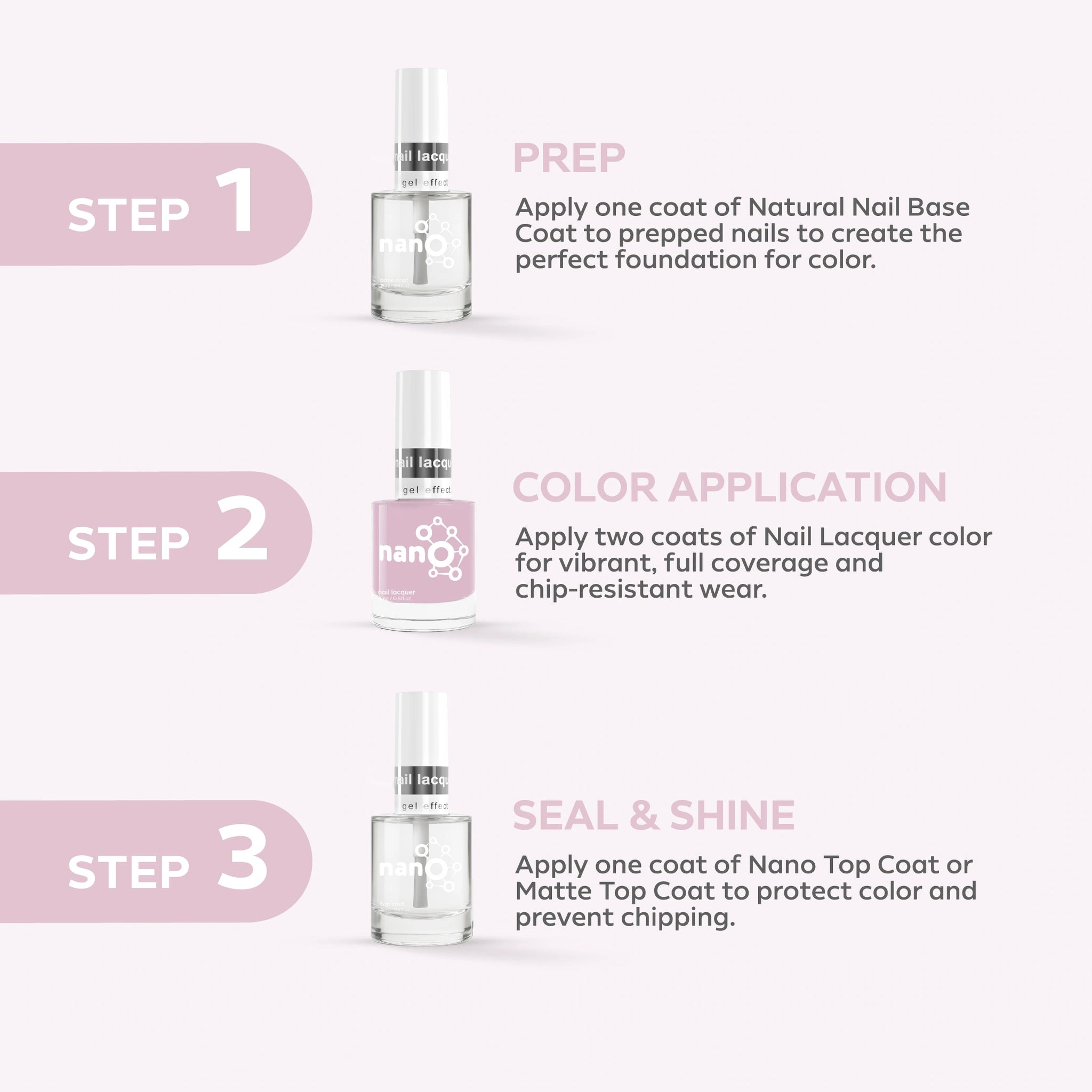 - ضعي طبقة من Nano® Normal Base Coat لحماية أظافرك الطبيعية وضمان التصاق أفضل.