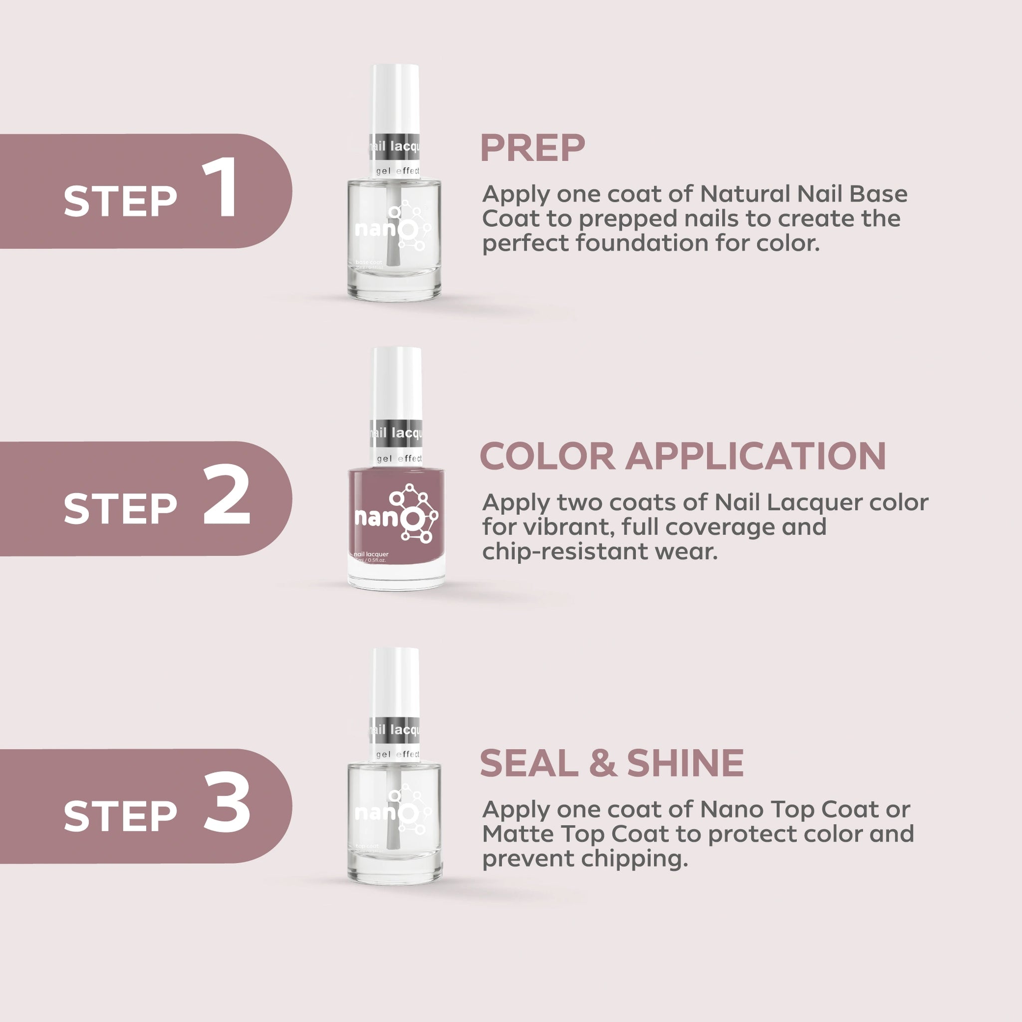 - ضعي طبقة من Nano® Normal Base Coat لحماية أظافرك الطبيعية وضمان التصاق أفضل.