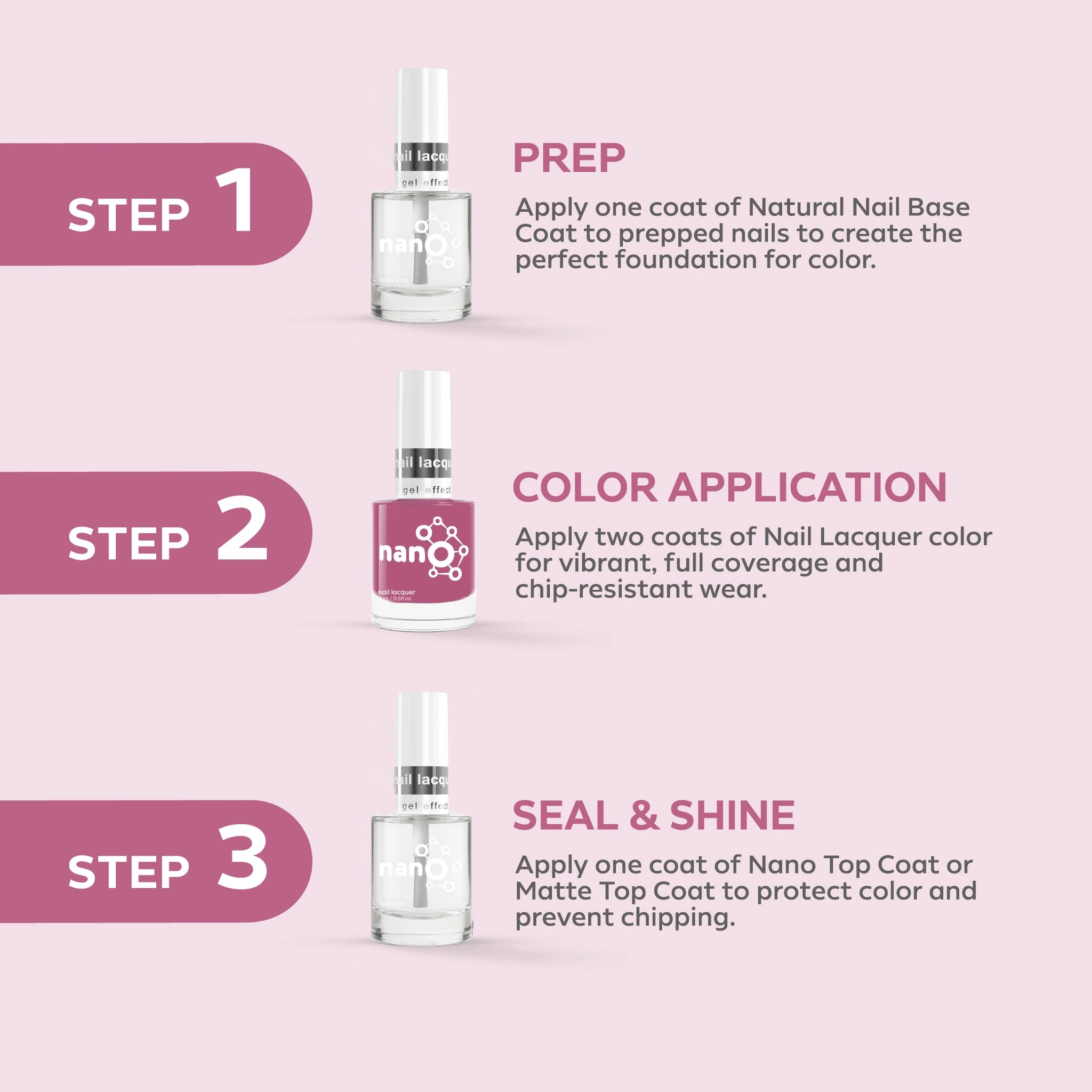 - ضعي طبقة من Nano® Normal Base Coat لحماية أظافرك الطبيعية وضمان التصاق أفضل.