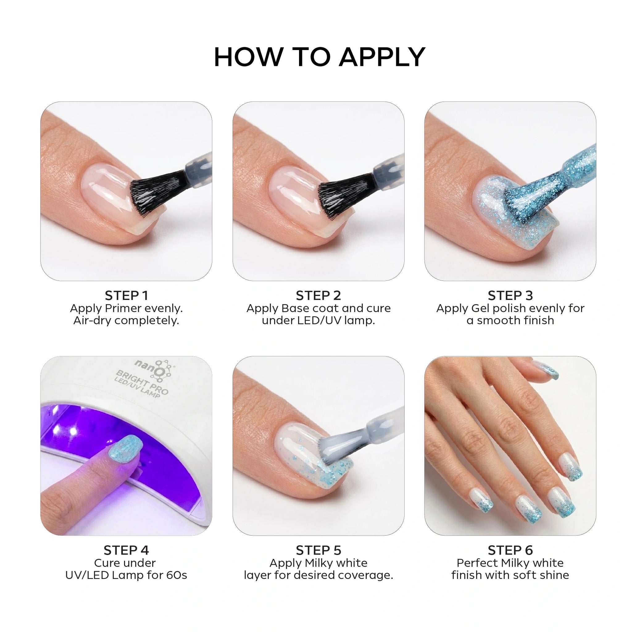 - ضعي طلاء الأظافر الجل Nano® المفضل لديك واتركيه حتى يجف تحت مصباح Nano® Bright UV/LED لمدة 60 ثانية.