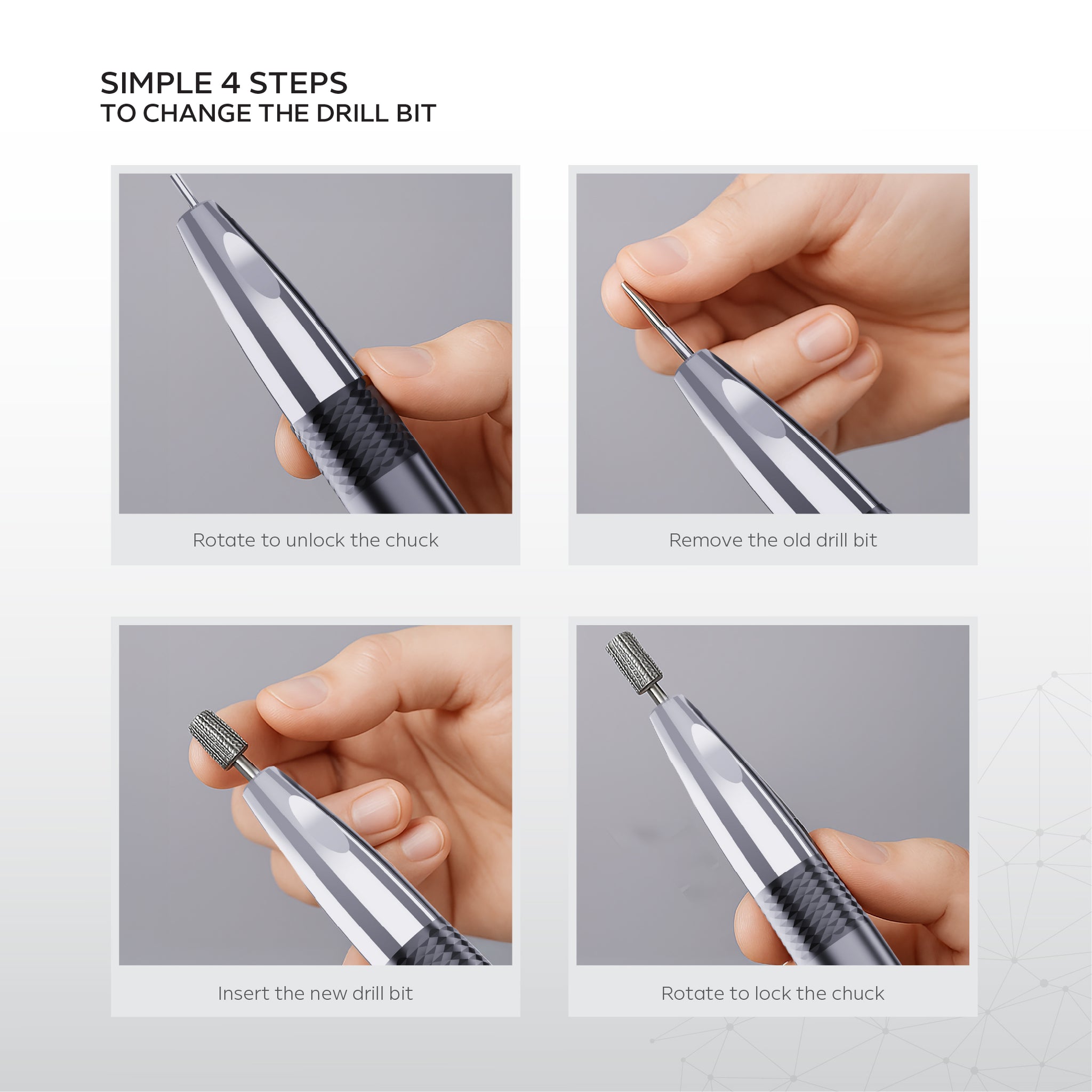 - Insert your preferred drill bit securely into the handpiece.