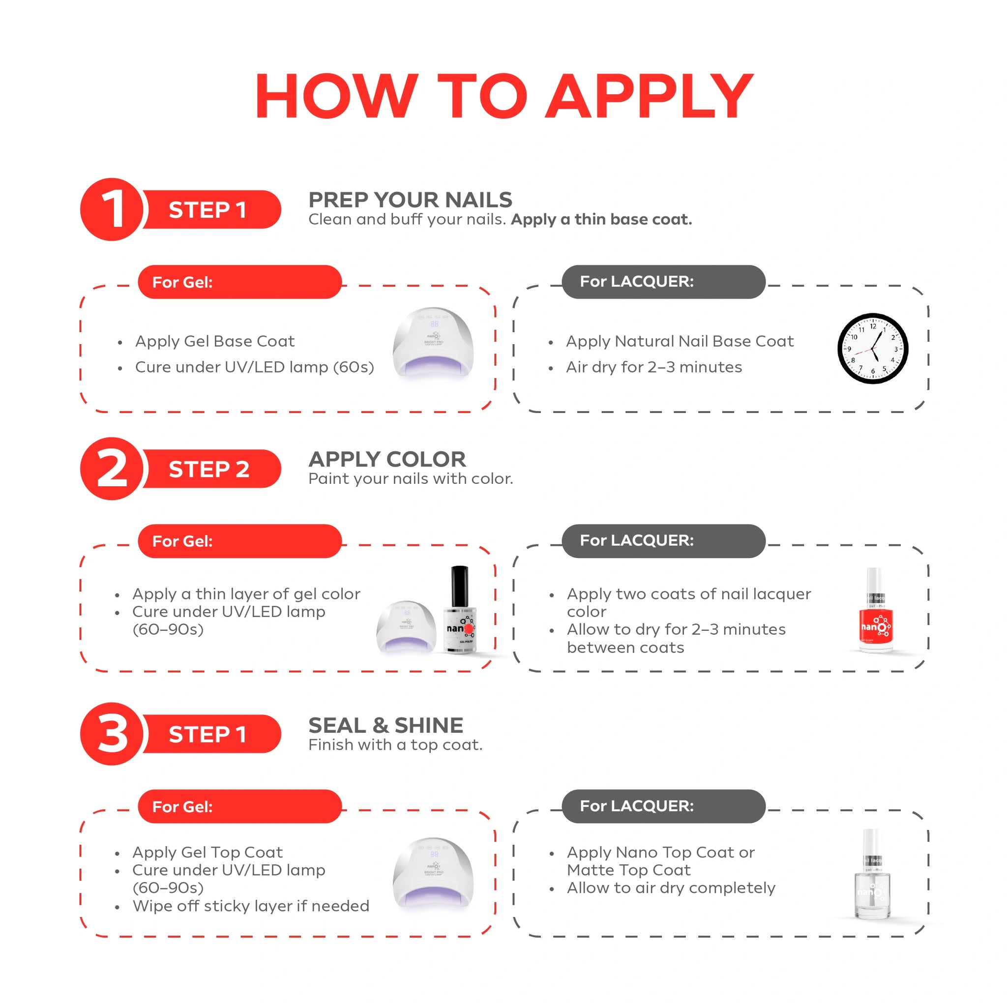 - Apply Normal Base Coat to protect natural nails and improve adhesion.