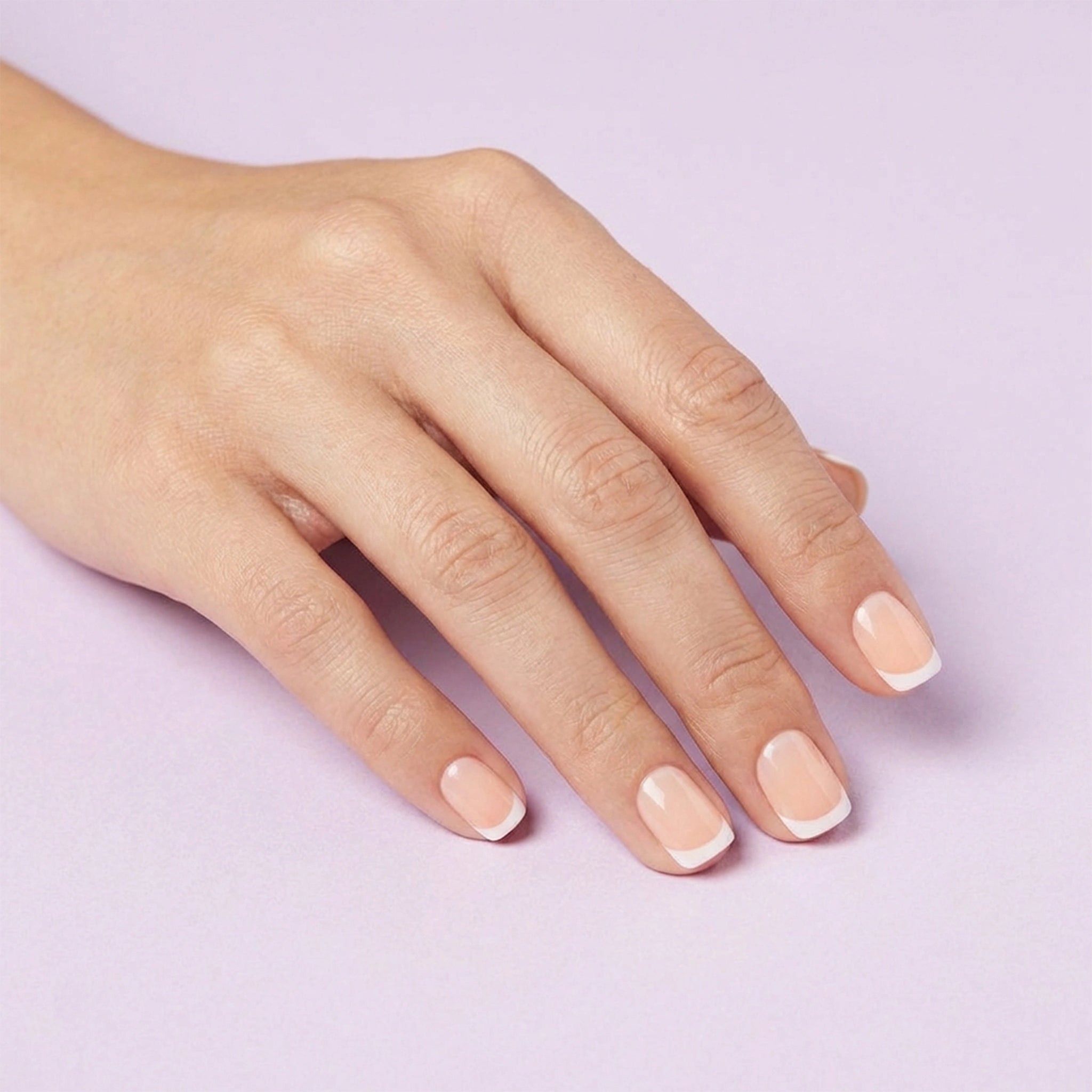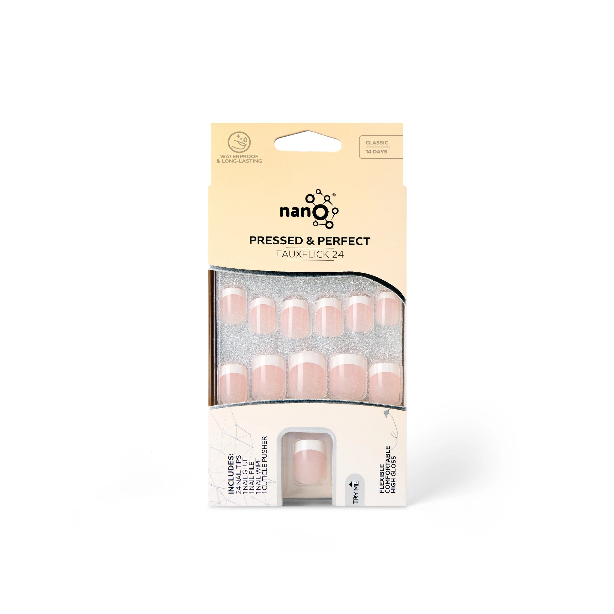 Nano® Parisian Whisper Pressed on Nails - 24pcs with Glue | Instant Gel-Like Shine, Soft Pink French Tip Fake Nails Set