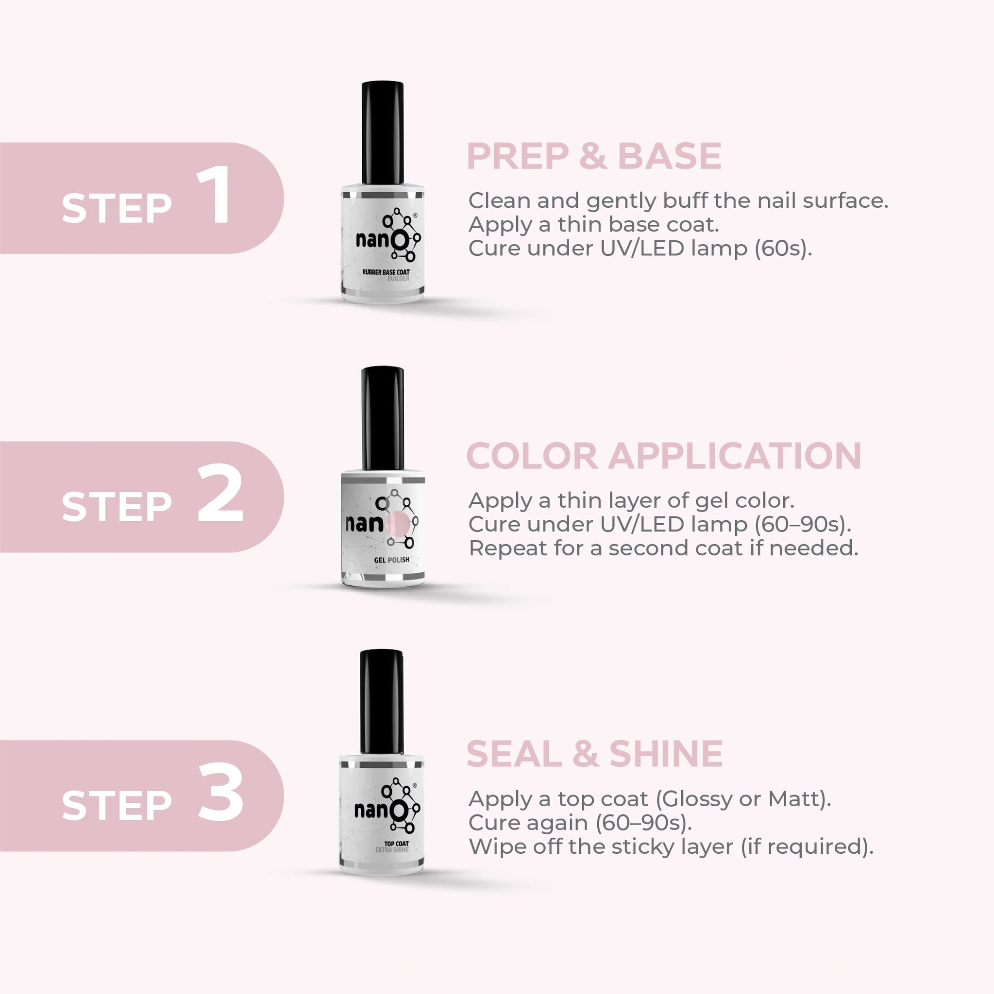 - ضعي طبقة ثانية من طلاء الأظافر الجل Nano® وجففيها تحت مصباح Nano UV/LED لمدة 60 ثانية إضافية.