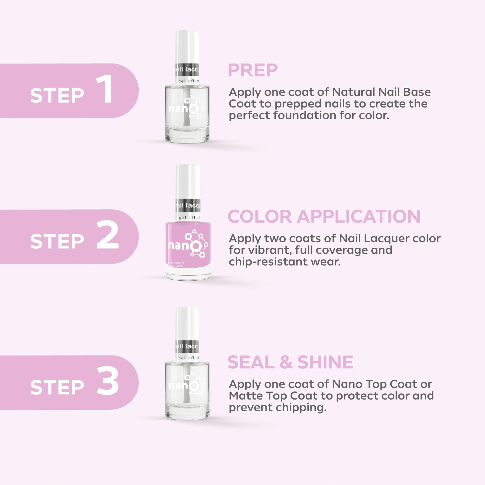 - ضعي طبقة من Nano® Normal Base Coat لحماية أظافرك الطبيعية وضمان التصاق أفضل.