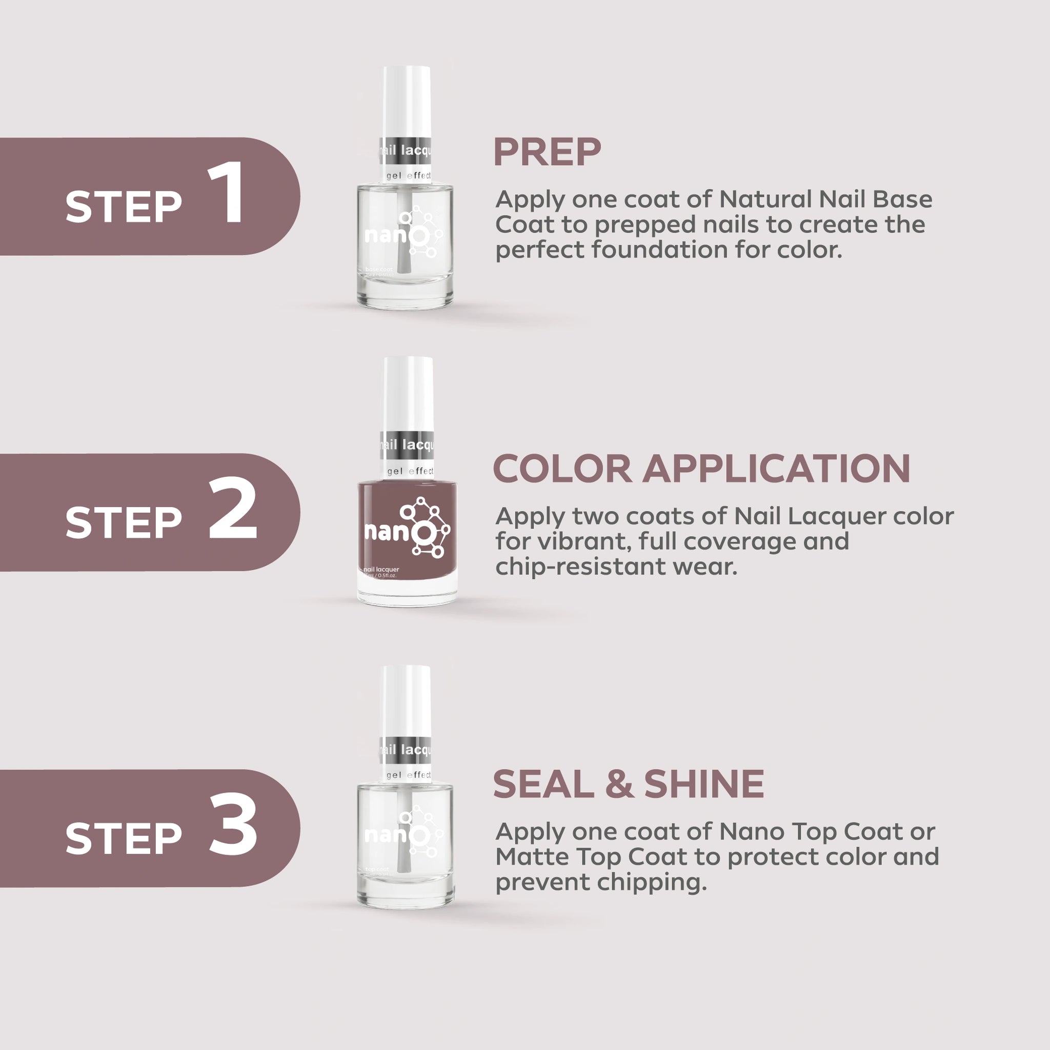 - ضعي طبقة من Nano® Normal Base Coat لحماية أظافرك الطبيعية وضمان التصاق أفضل.