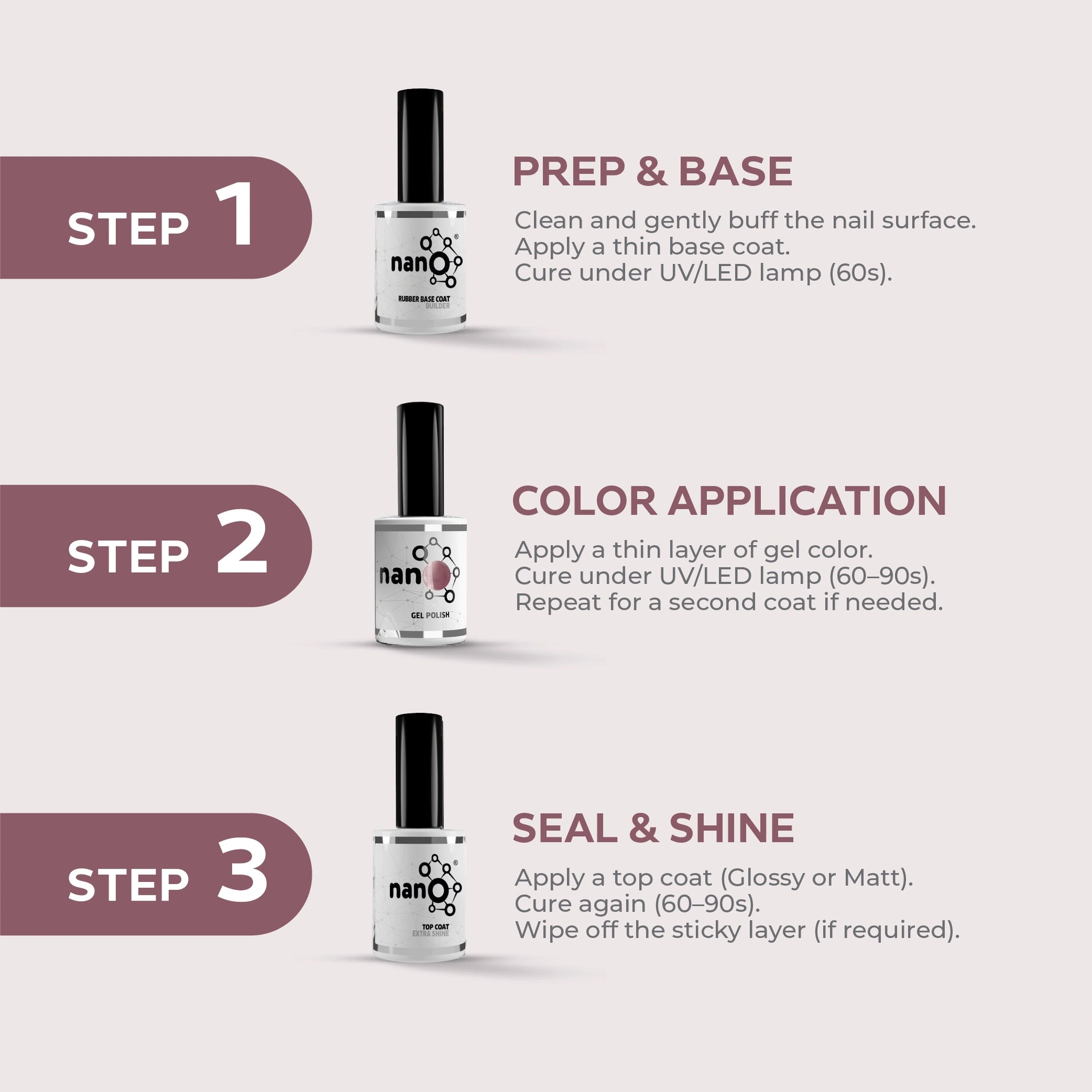 - ضعي طبقة القاعدة Nano® / Light Builder المفضلة لديك على الأظافر النظيفة وجففيها تحت مصباح Nano® Bright UV/LED لمدة 60 ثانية.