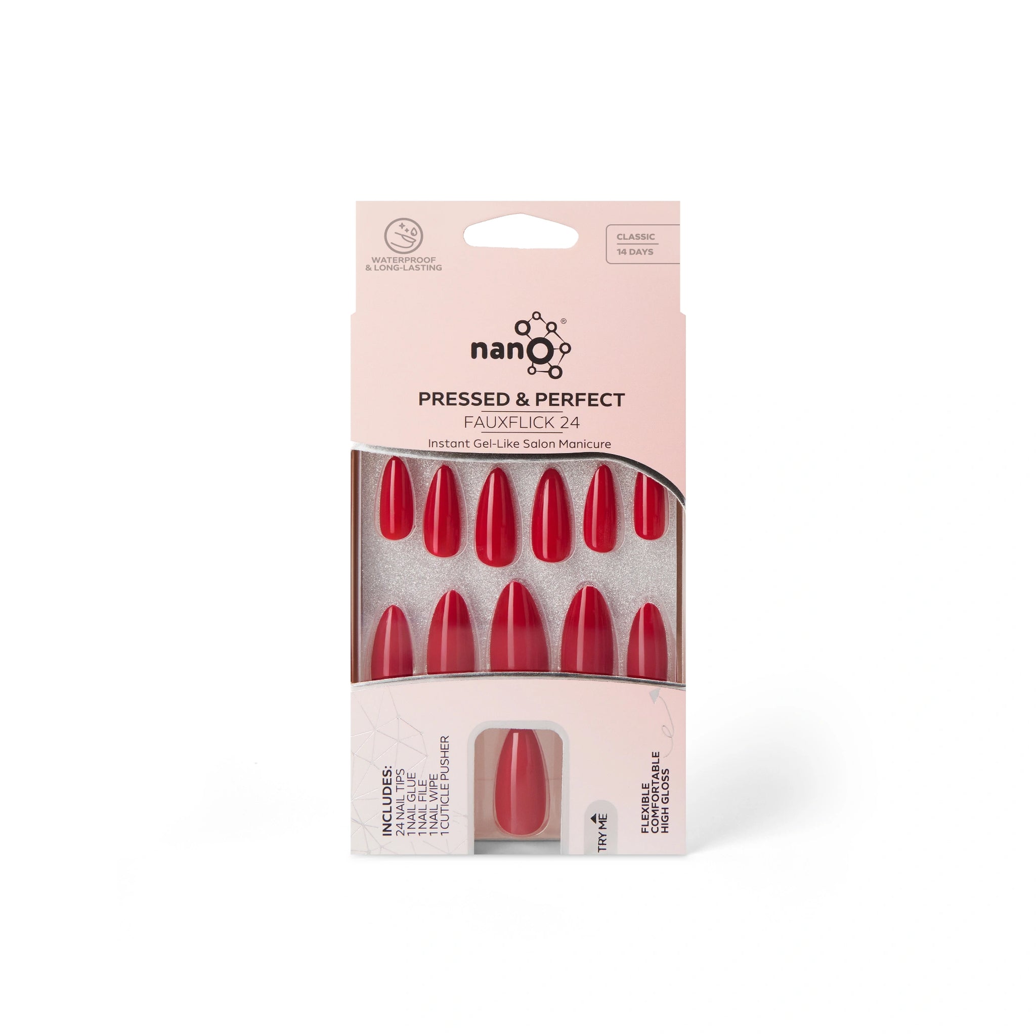 Nano® Scarlet Queen Pressed on Nails - 24pcs with Glue | Instant Gel-Like Shine, Classic Red Glossy Fake Nails Set