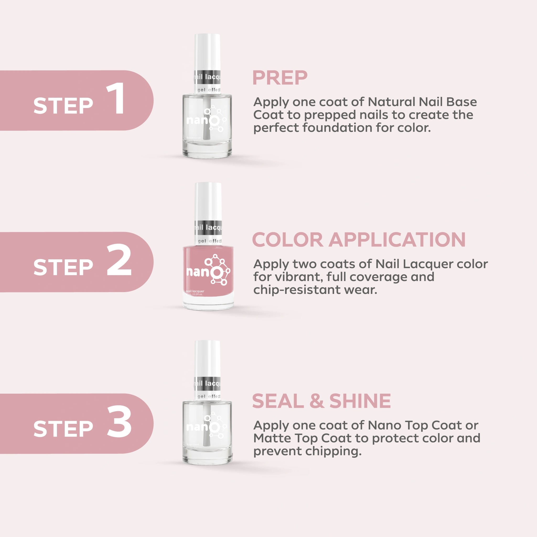 - ضعي طبقة من Nano® Normal Base Coat لحماية أظافرك الطبيعية وضمان التصاق أفضل.