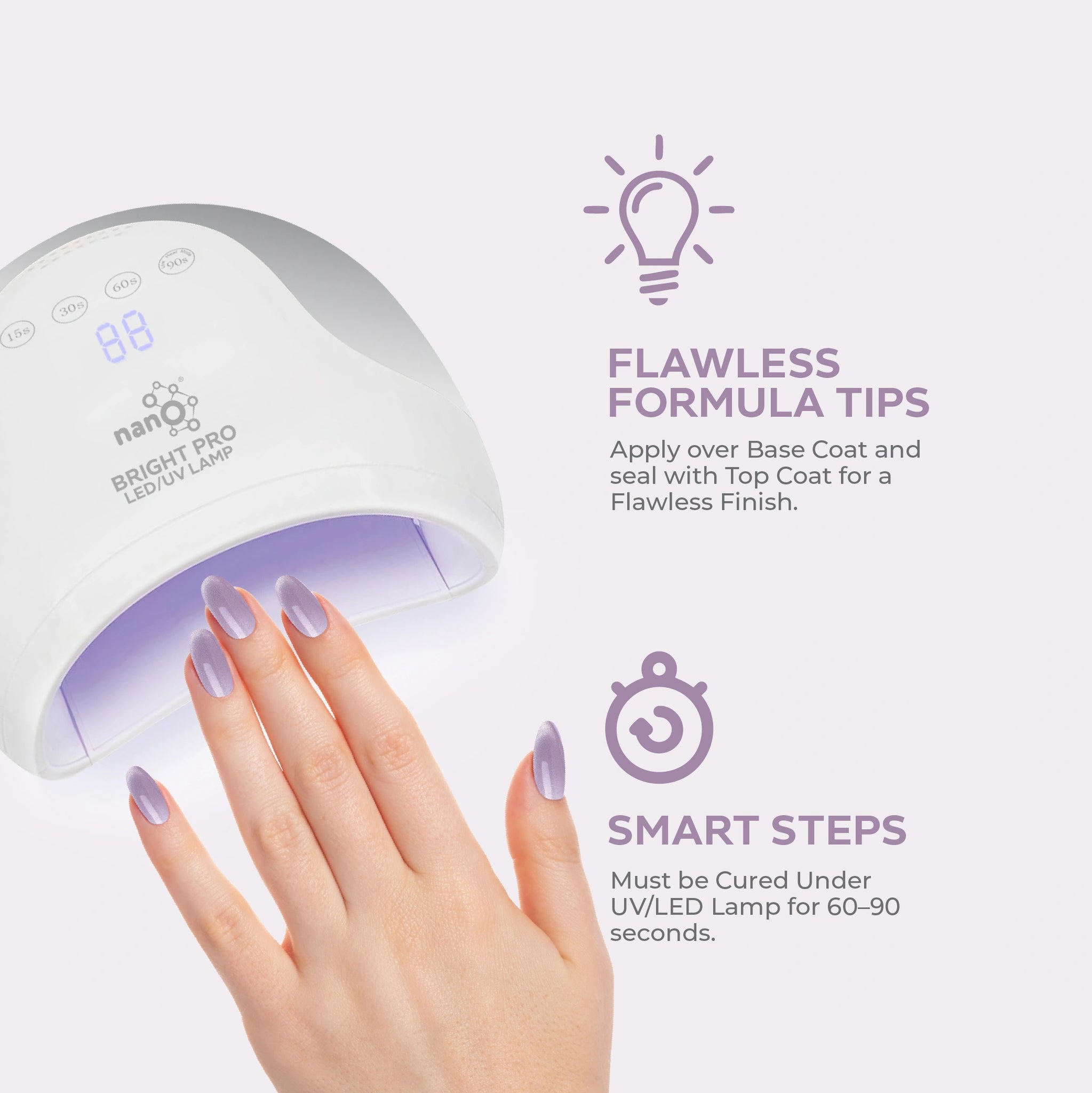 4. ضعي طبقة القاعدة Nano® / Light Builder المفضلة لديك على الأظافر النظيفة وجففيها تحت مصباح Nano® Bright UV/LED لمدة 60 ثانية.