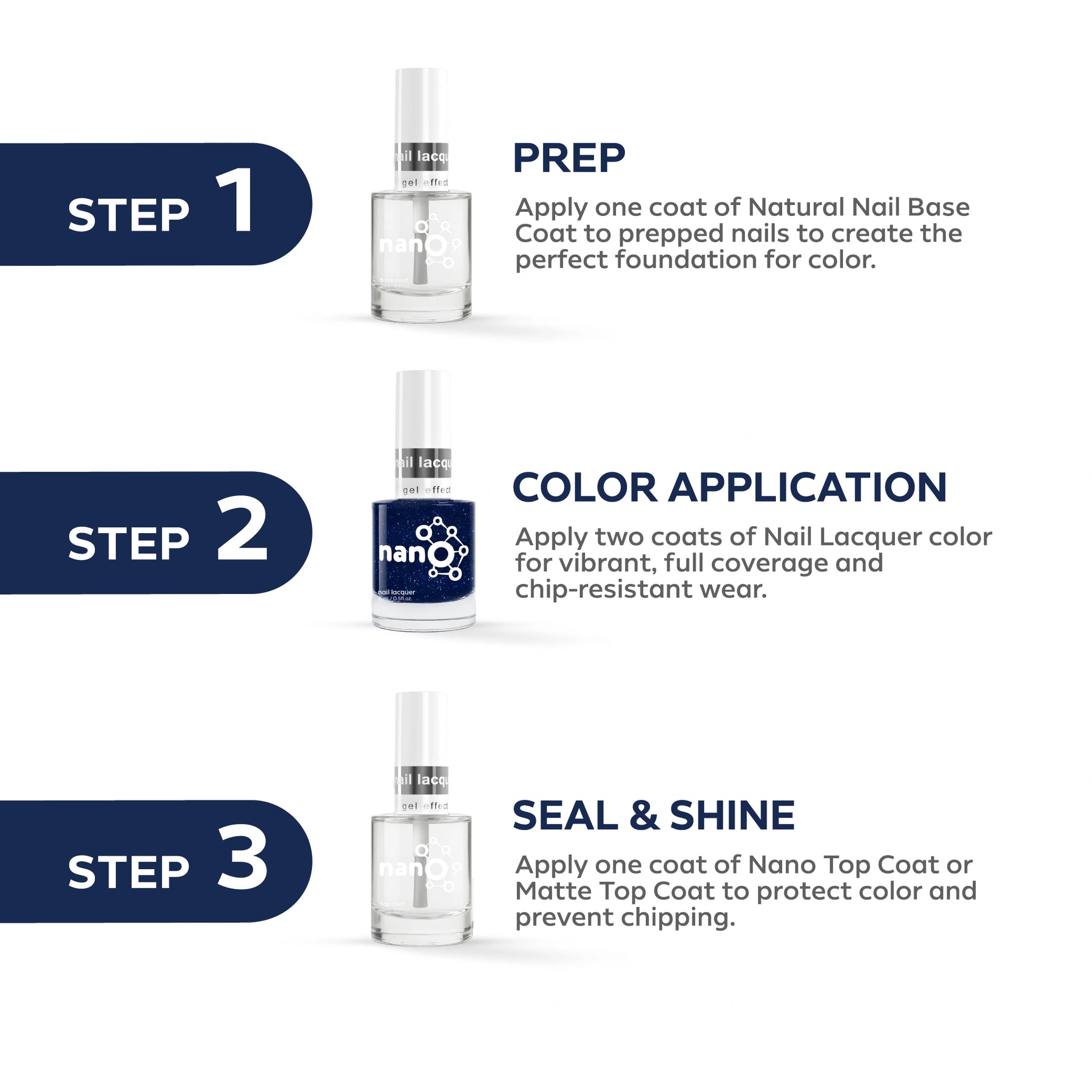 - قم بإنهاء العمل عن طريق تطبيق Nano® Normal Top Coat للحصول على لمسة نهائية لامعة تدوم طويلاً.