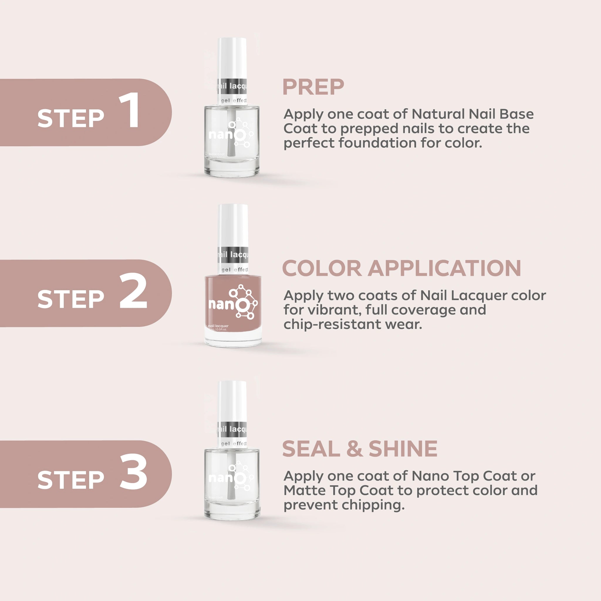 - ضعي طبقة من Nano® Normal Base Coat لحماية أظافرك الطبيعية وضمان التصاق أفضل.