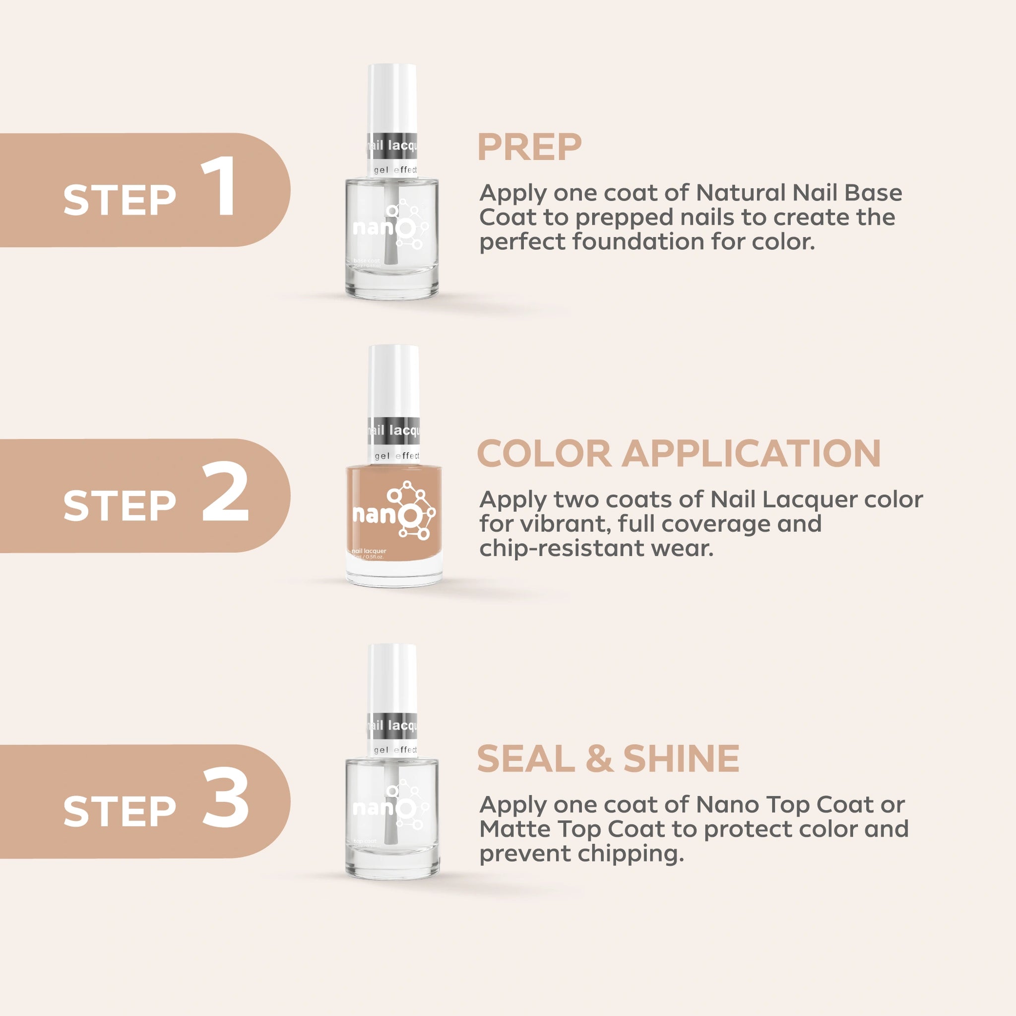 - ضعي طبقة من Nano® Normal Base Coat لحماية أظافرك الطبيعية وضمان التصاق أفضل.