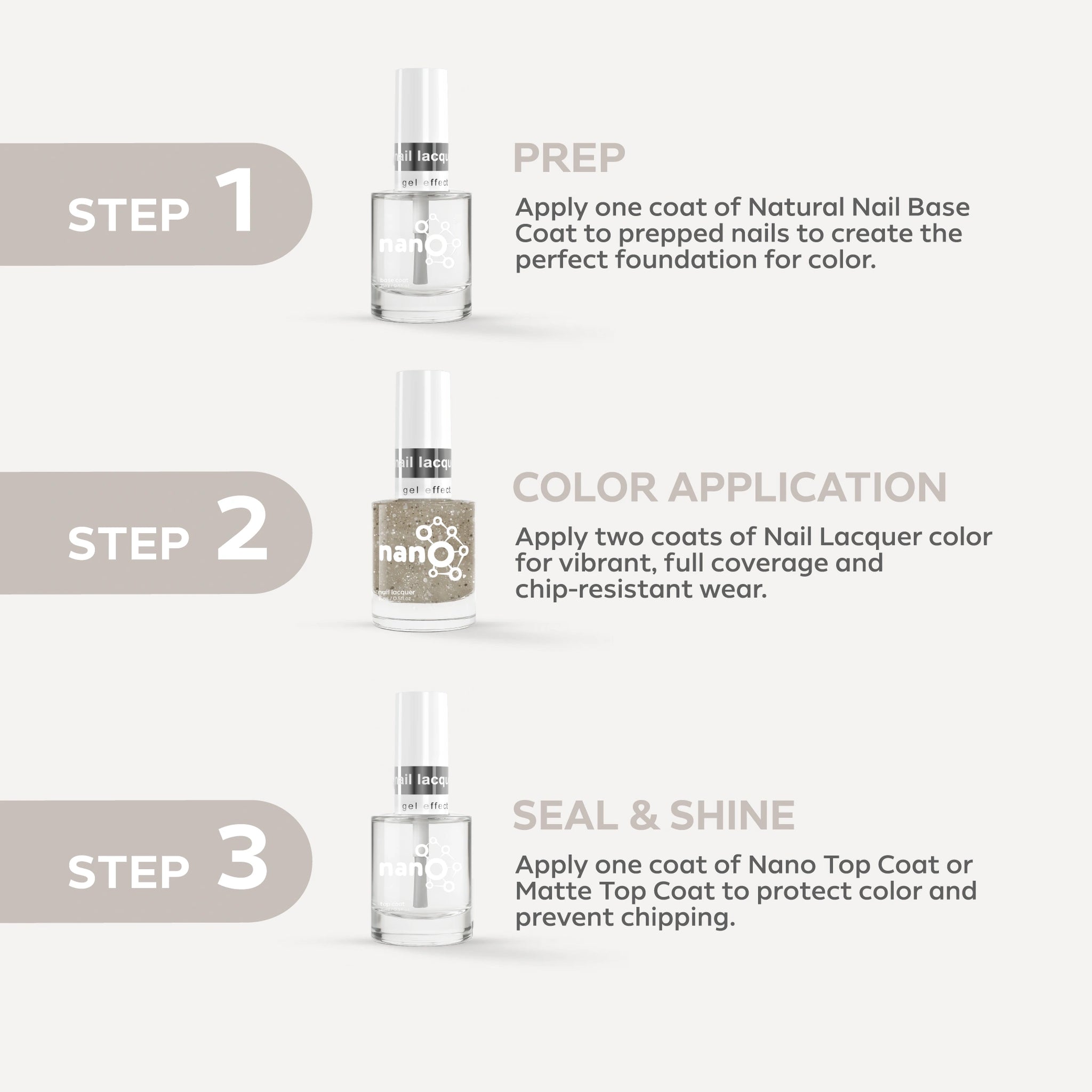 - ضعي طبقة من Nano® Normal Base Coat لحماية أظافرك الطبيعية وضمان التصاق أفضل.