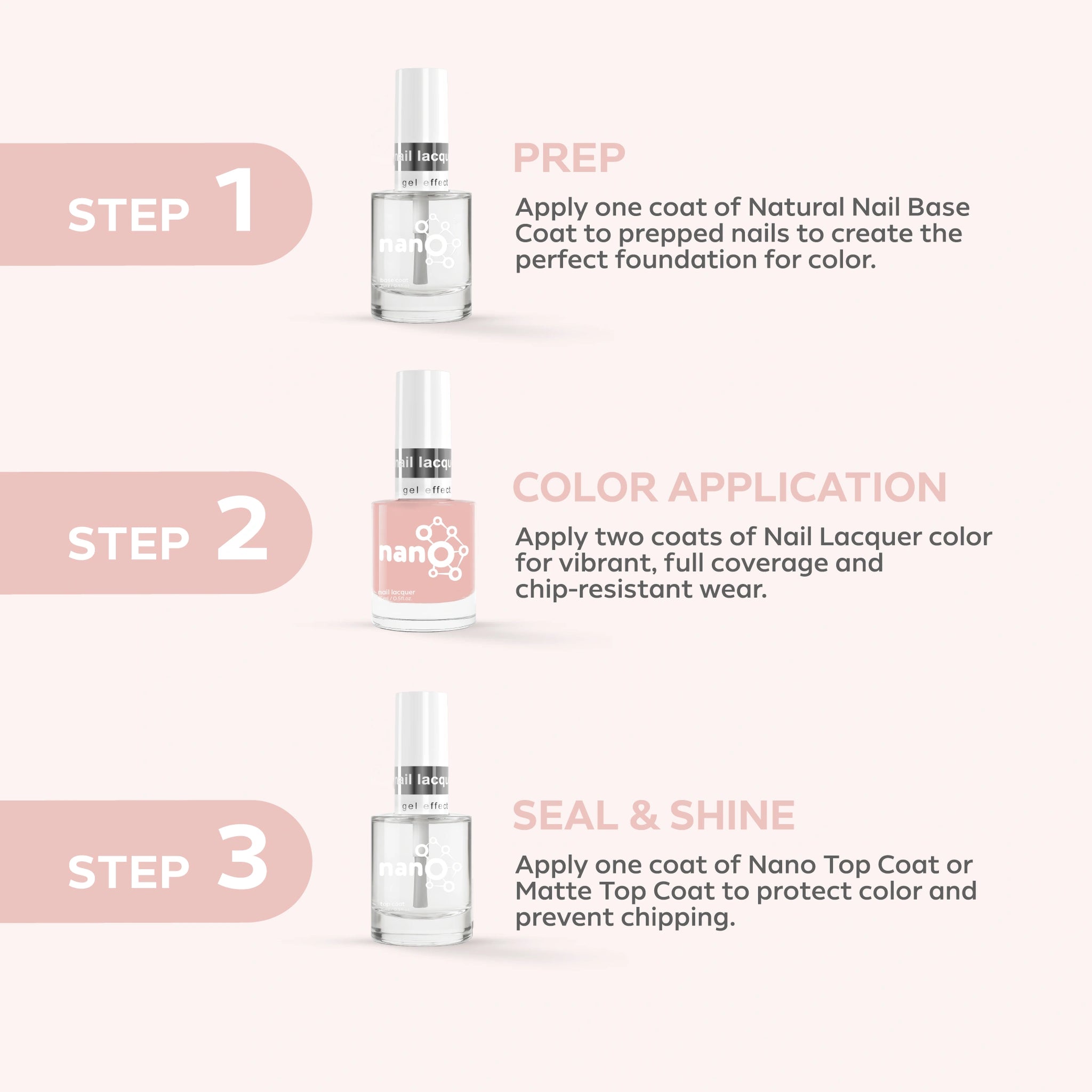 - ضعي طبقة من Nano® Normal Base Coat لحماية أظافرك الطبيعية وضمان التصاق أفضل.