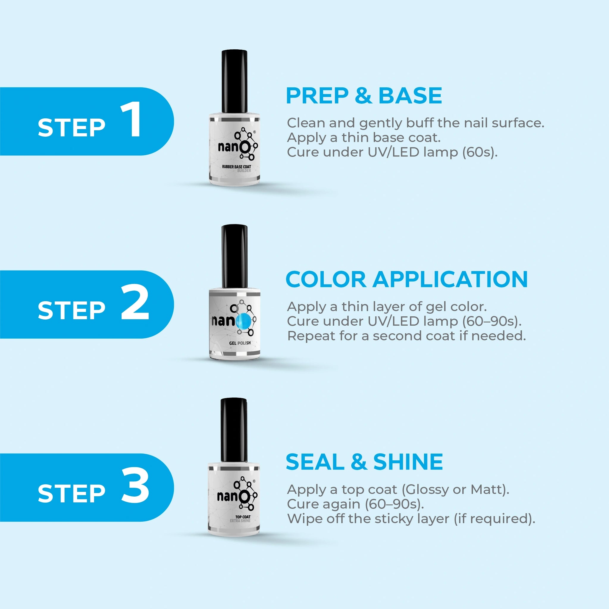 - Apply a second layer of Nano® gel nail polish and cure it under the Nano UV/LED lamp for an additional 60 seconds.