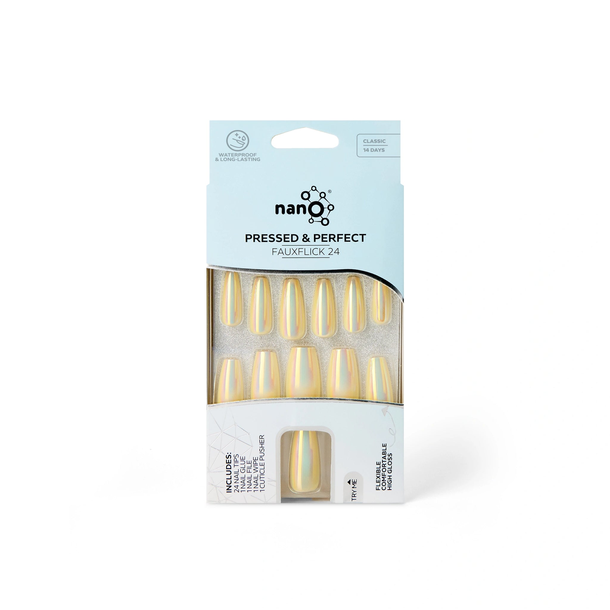 Nano® Chrome Golden Ember Pressed on Nails - 24pcs with Glue | Instant Gel-Like Shine, Gold Chrome Glossy Fake Nails Set