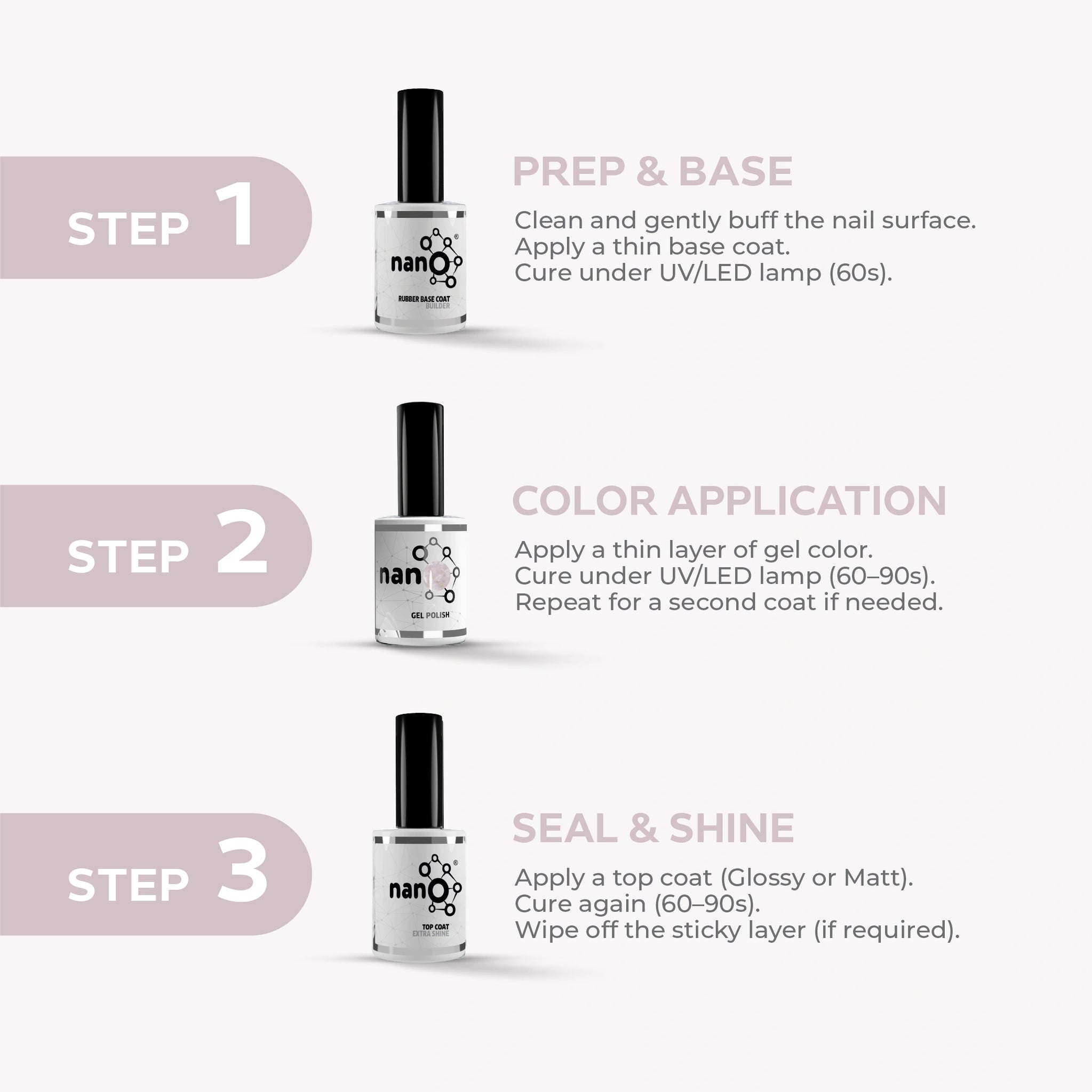 5. Apply the first layer of Nano gel nail polish over the base coat and cure it for 60 seconds under a UV/LED lamp.