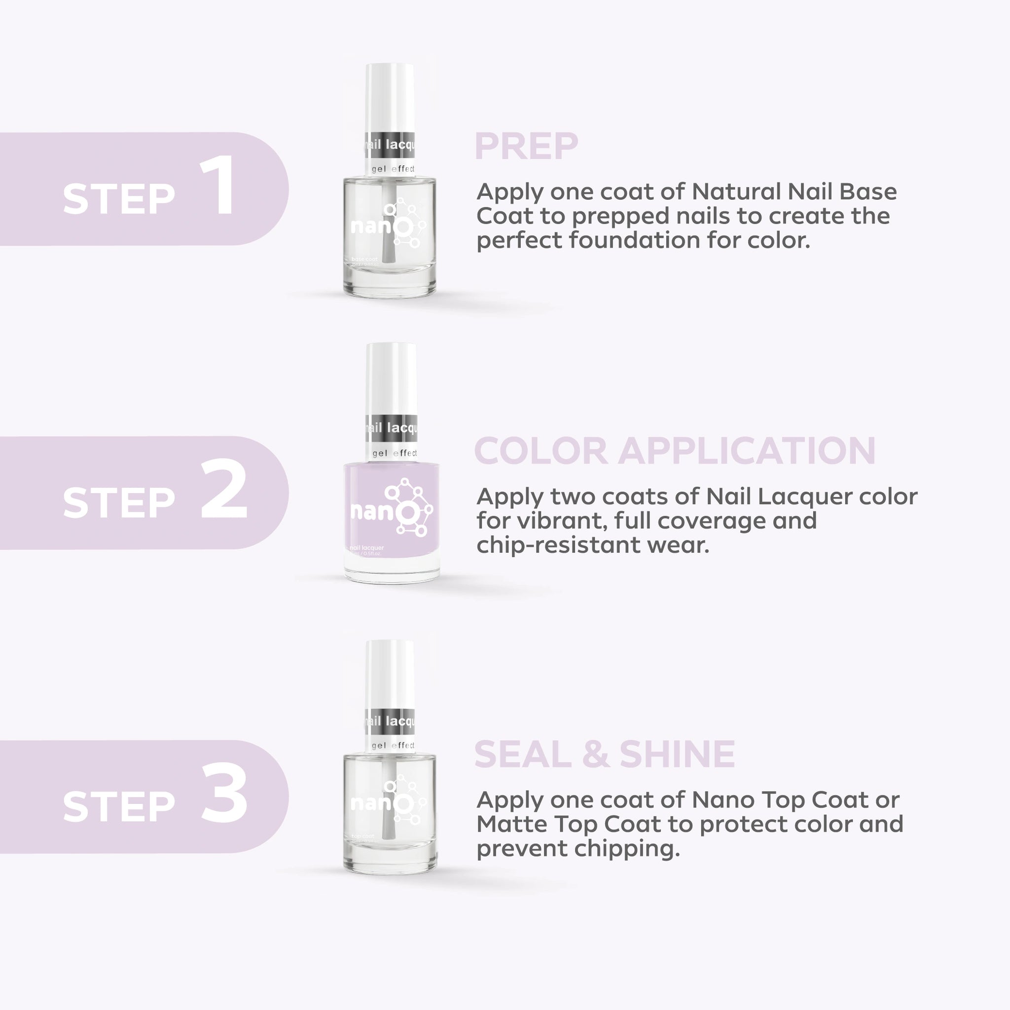 - Finish by applying Nano® Normal Top Coat for a long-lasting, high-gloss finish.