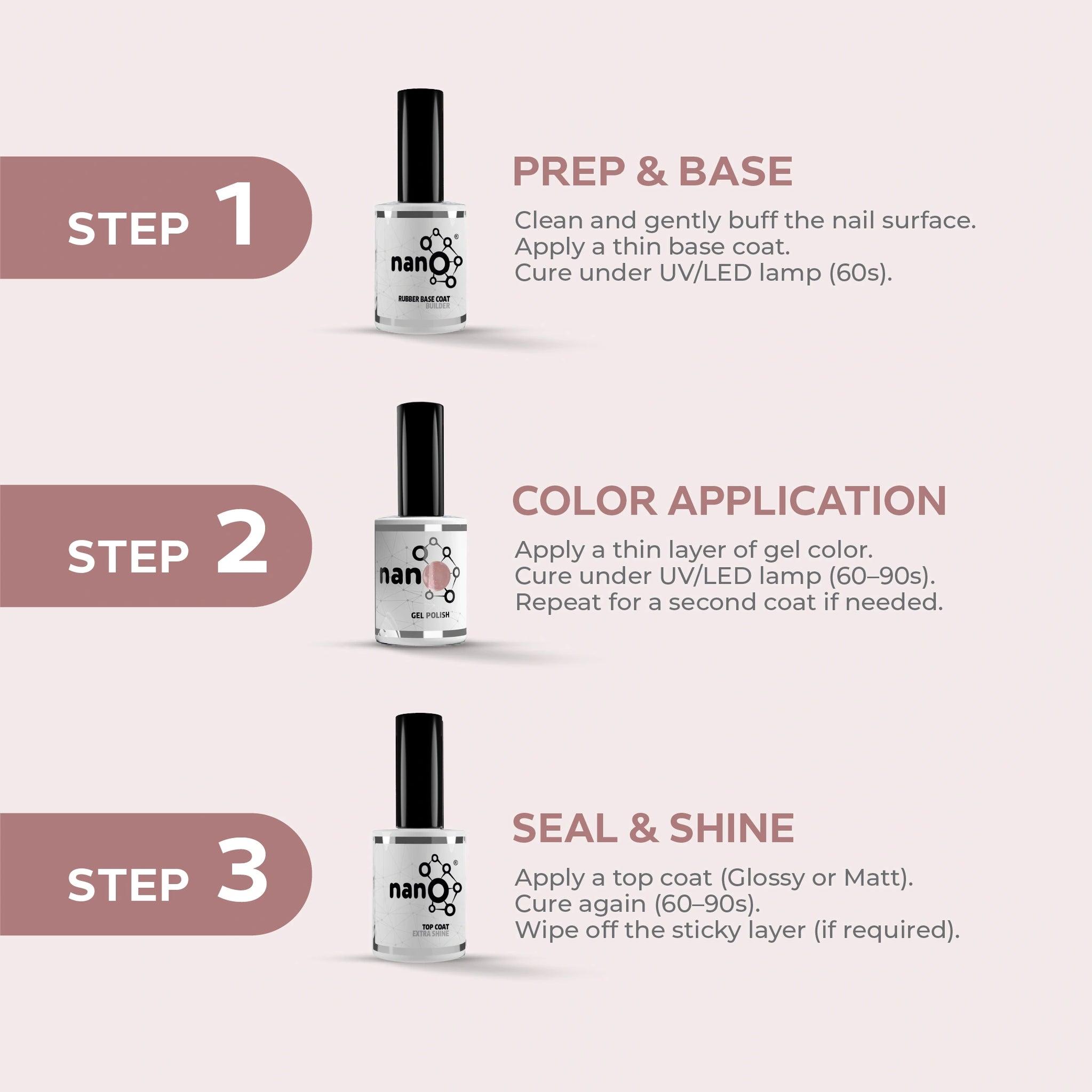 - Apply a second layer of Nano® gel nail polish and cure it under the Nano UV/LED lamp for an additional 60 seconds.