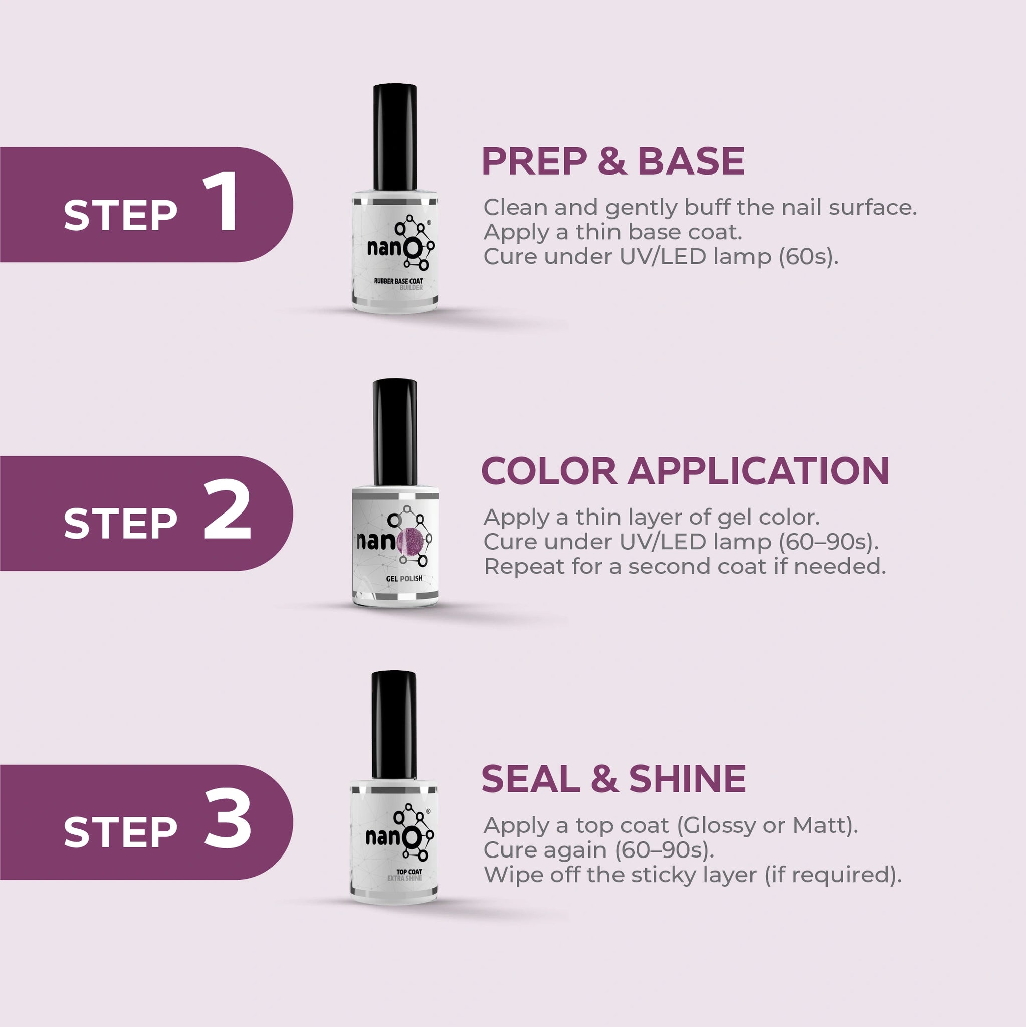 - Apply a second layer of Nano® gel nail polish and cure it under the Nano UV/LED lamp for an additional 60 seconds.