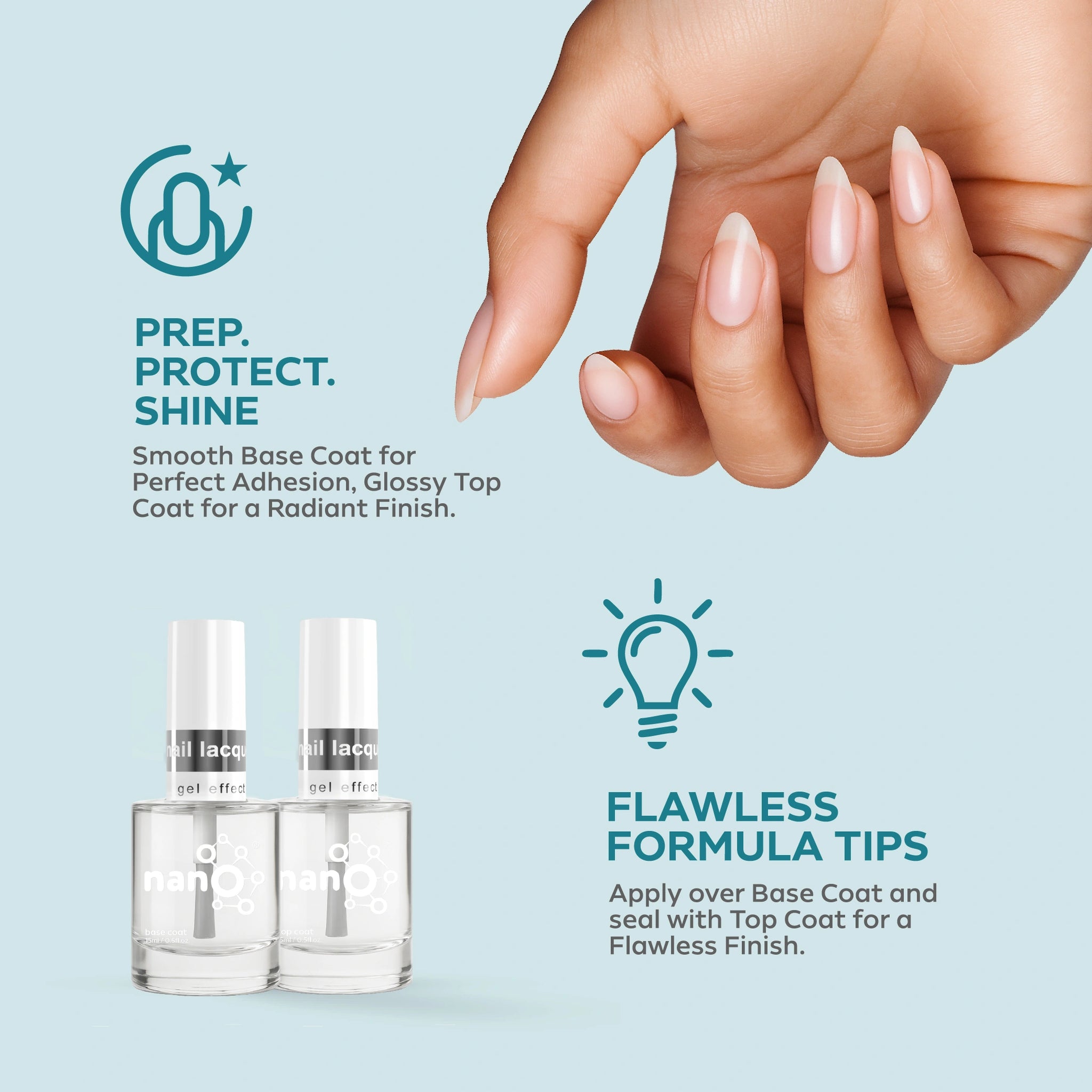 - Apply a layer of Nano® Normal Base Coat to protect your natural nails and ensure better adhesion.