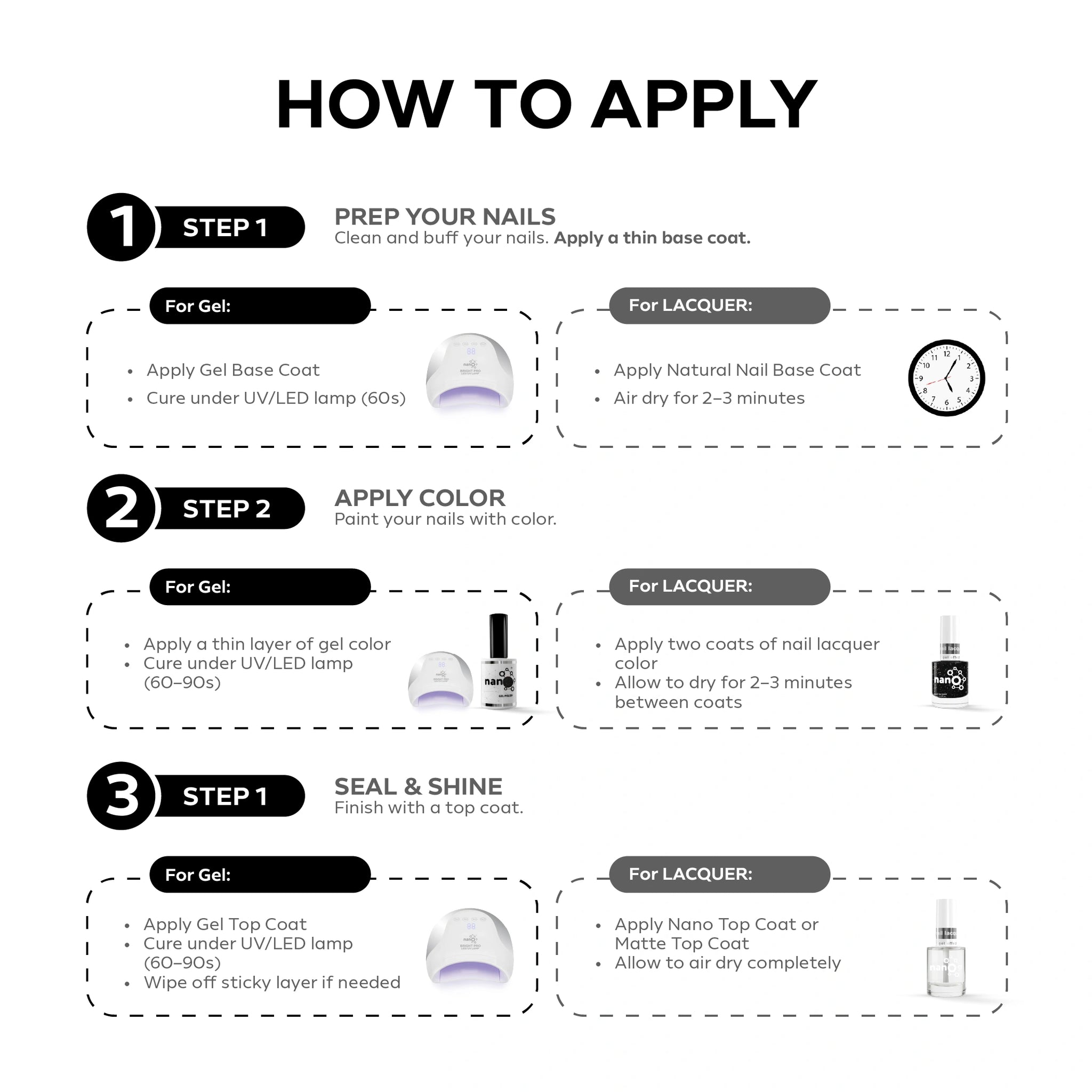 - Apply Normal Base Coat to protect natural nails and improve adhesion.