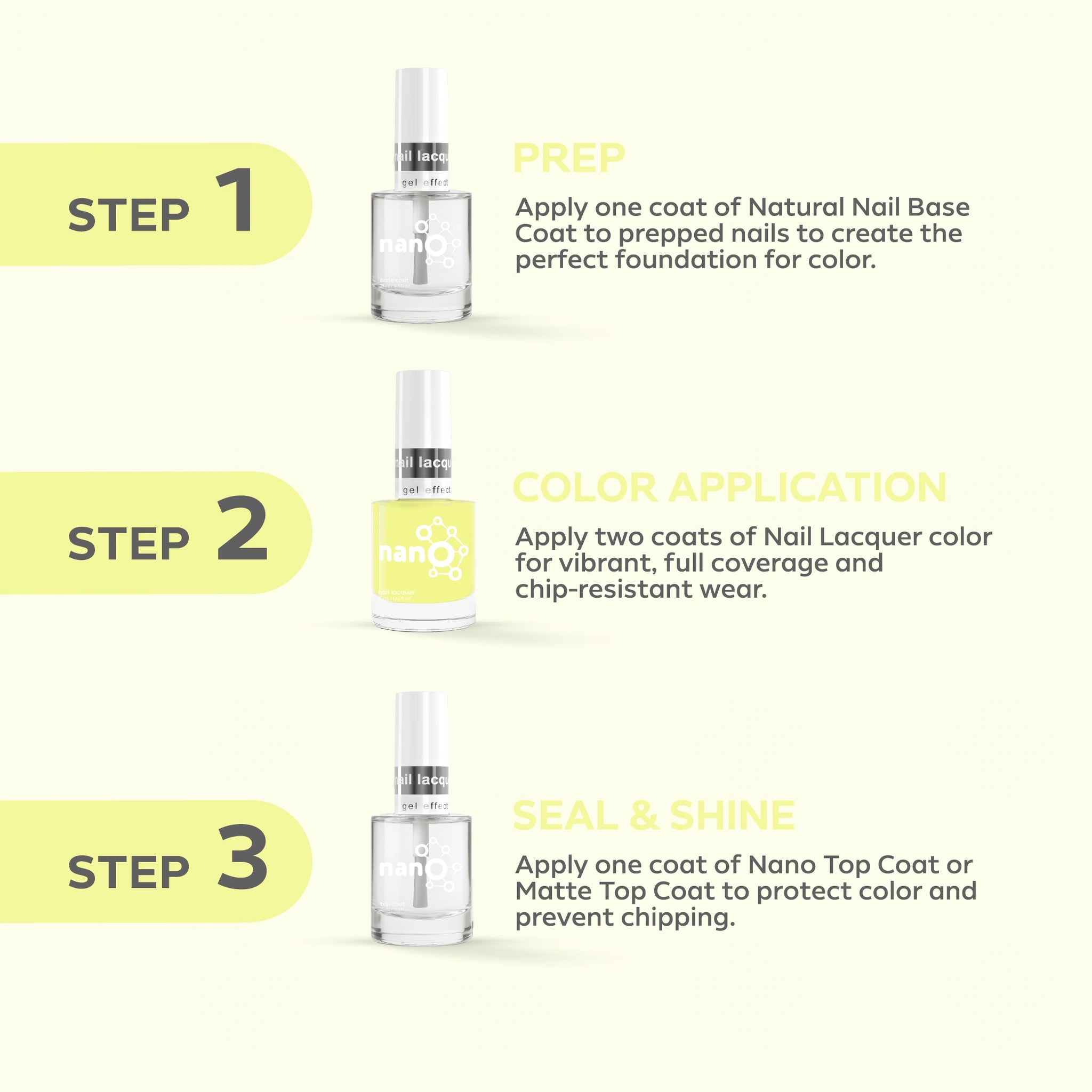 - Finish by applying Nano® Normal Top Coat for a long-lasting, high-gloss finish.