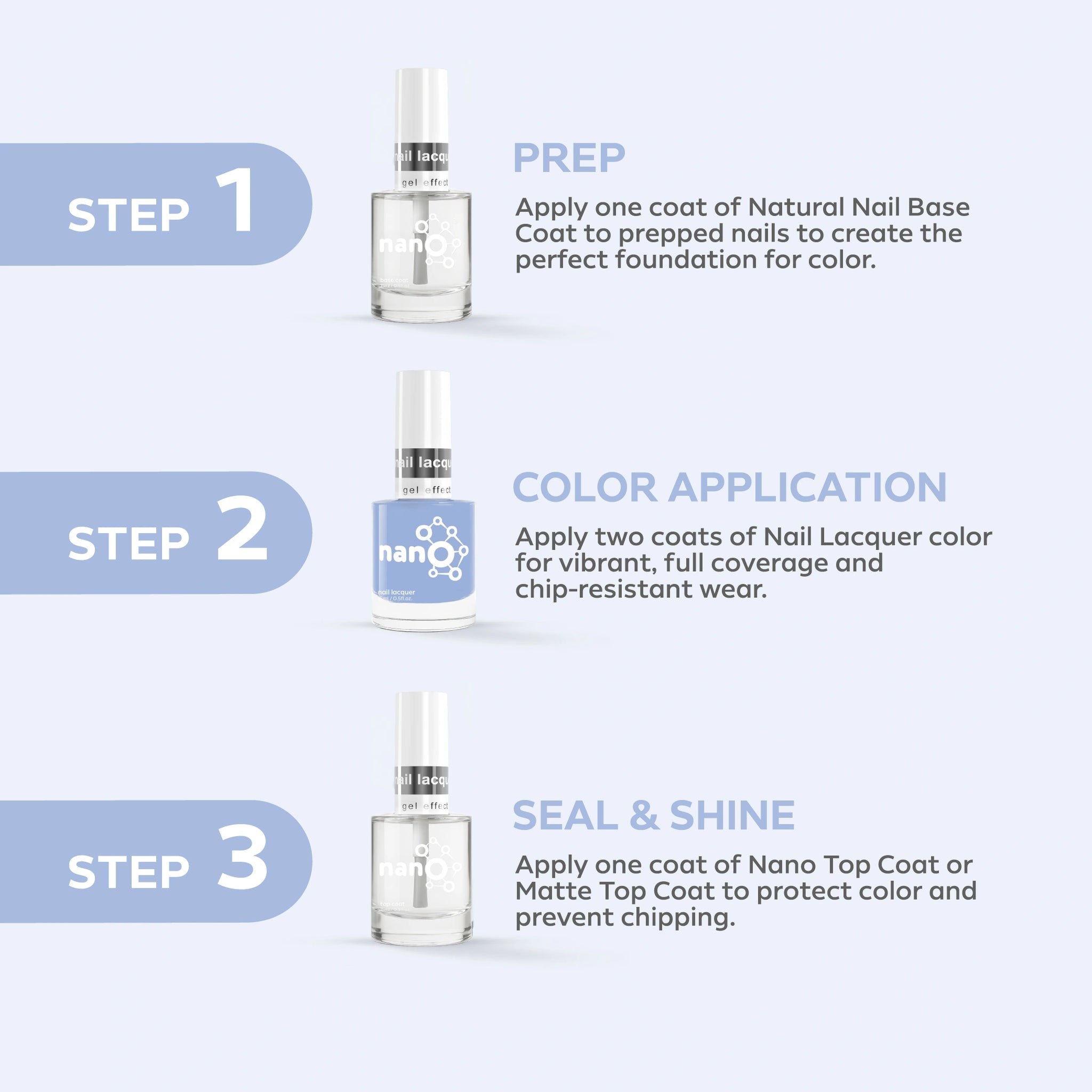 - Finish by applying Nano® Normal Top Coat for a long-lasting, high-gloss finish.