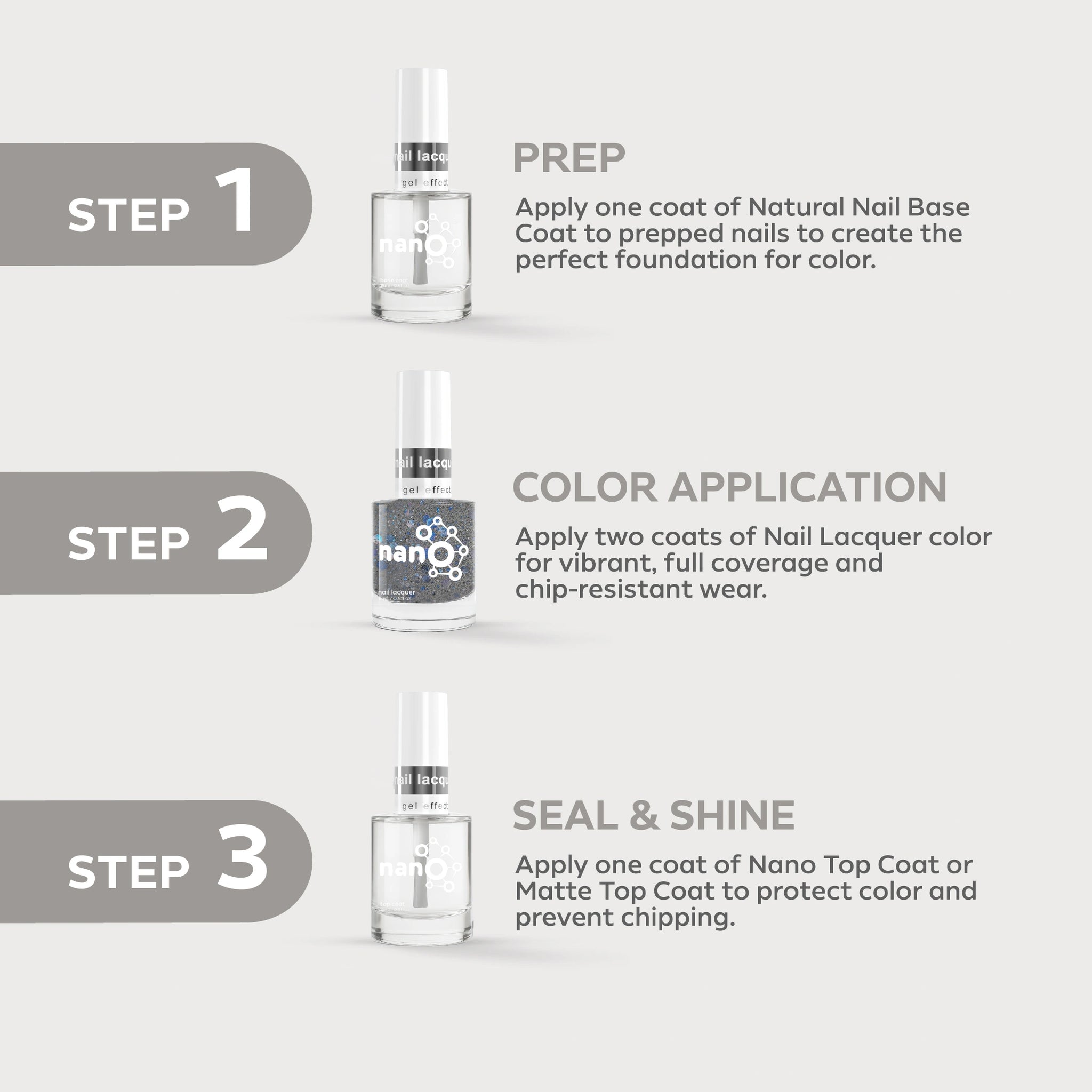 - Finish by applying Nano® Normal Top Coat for a long-lasting, high-gloss finish.