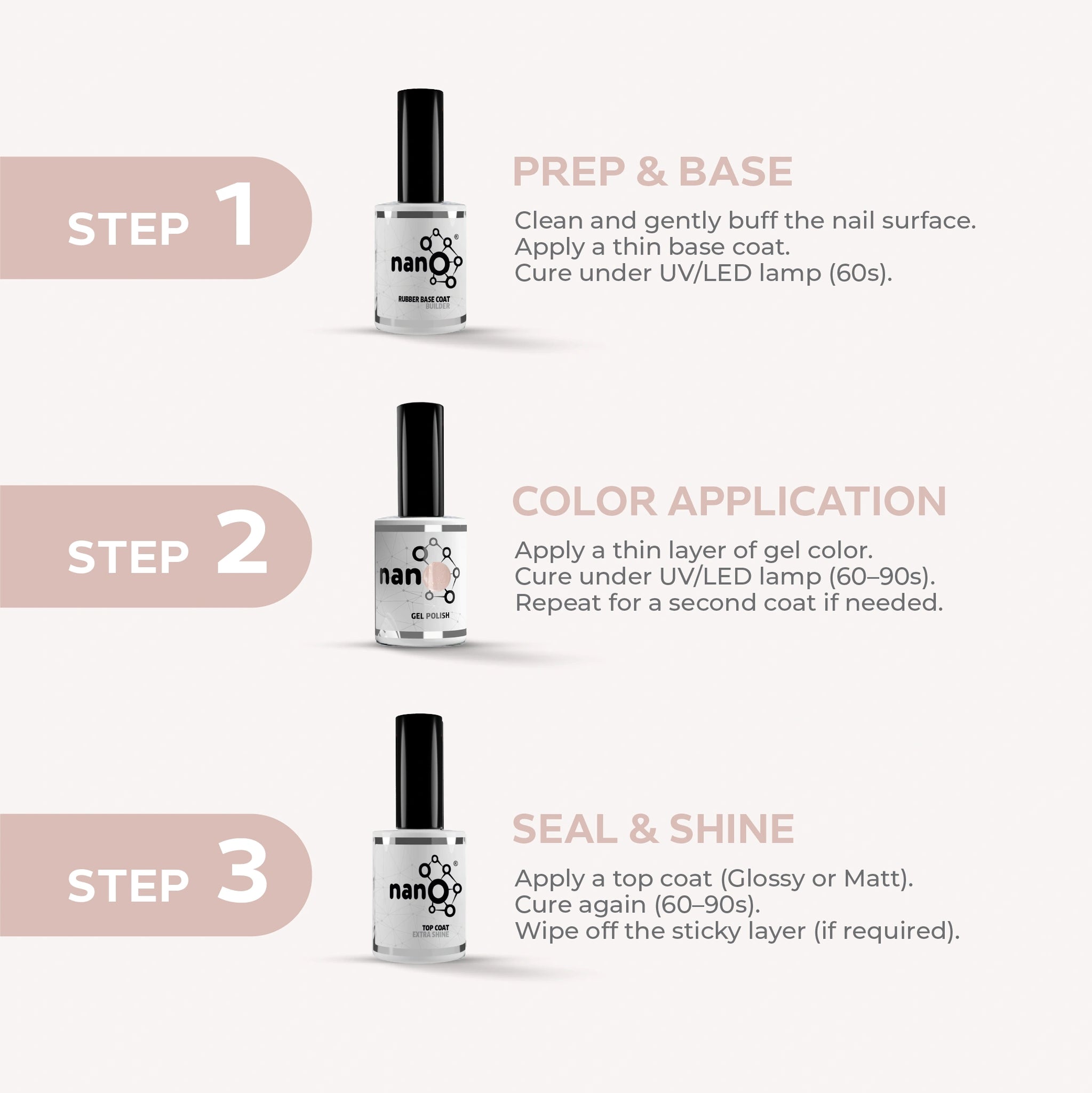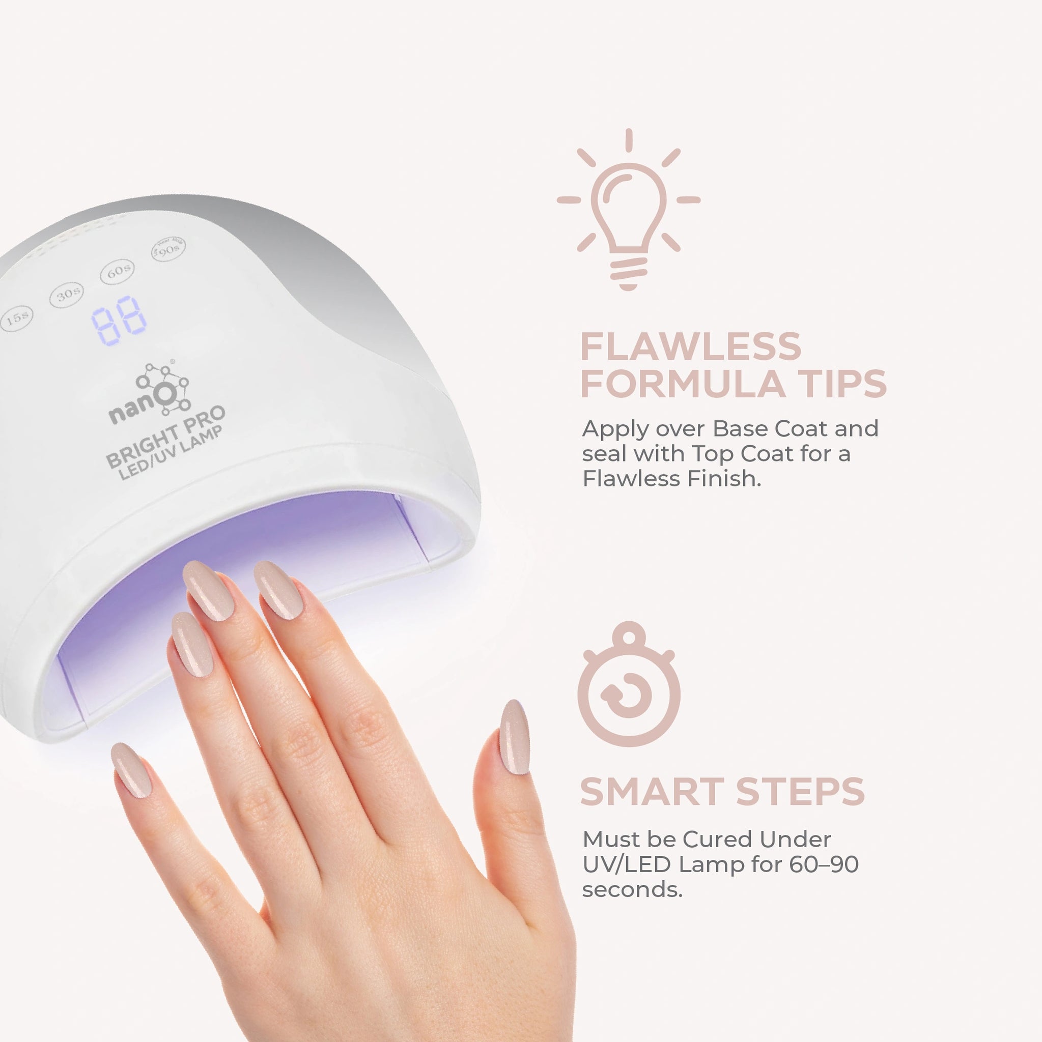 - Apply a second layer of Nano® gel nail polish and cure it under the Nano UV/LED lamp for an additional 60 seconds.