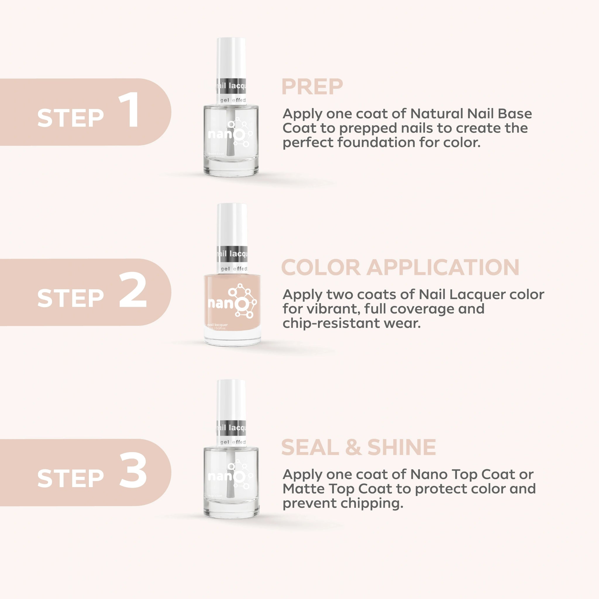 - Apply a layer of Nano® Normal Base Coat to protect your natural nails and ensure better adhesion.